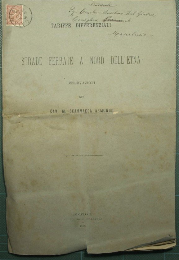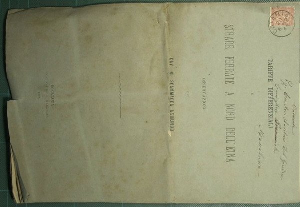 Osservazioni del Cav. M. Scammacca Asmundo - in 8° - pp.13 - Brossura editoriale - Nota a inchiostro al piatto superiore, strappo senza mancanze al margine delle pp.