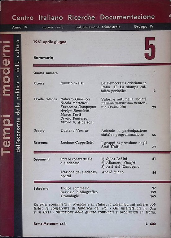 Tempi Moderni. Anno IV nuova serie N.5 aprile-giugno 1961