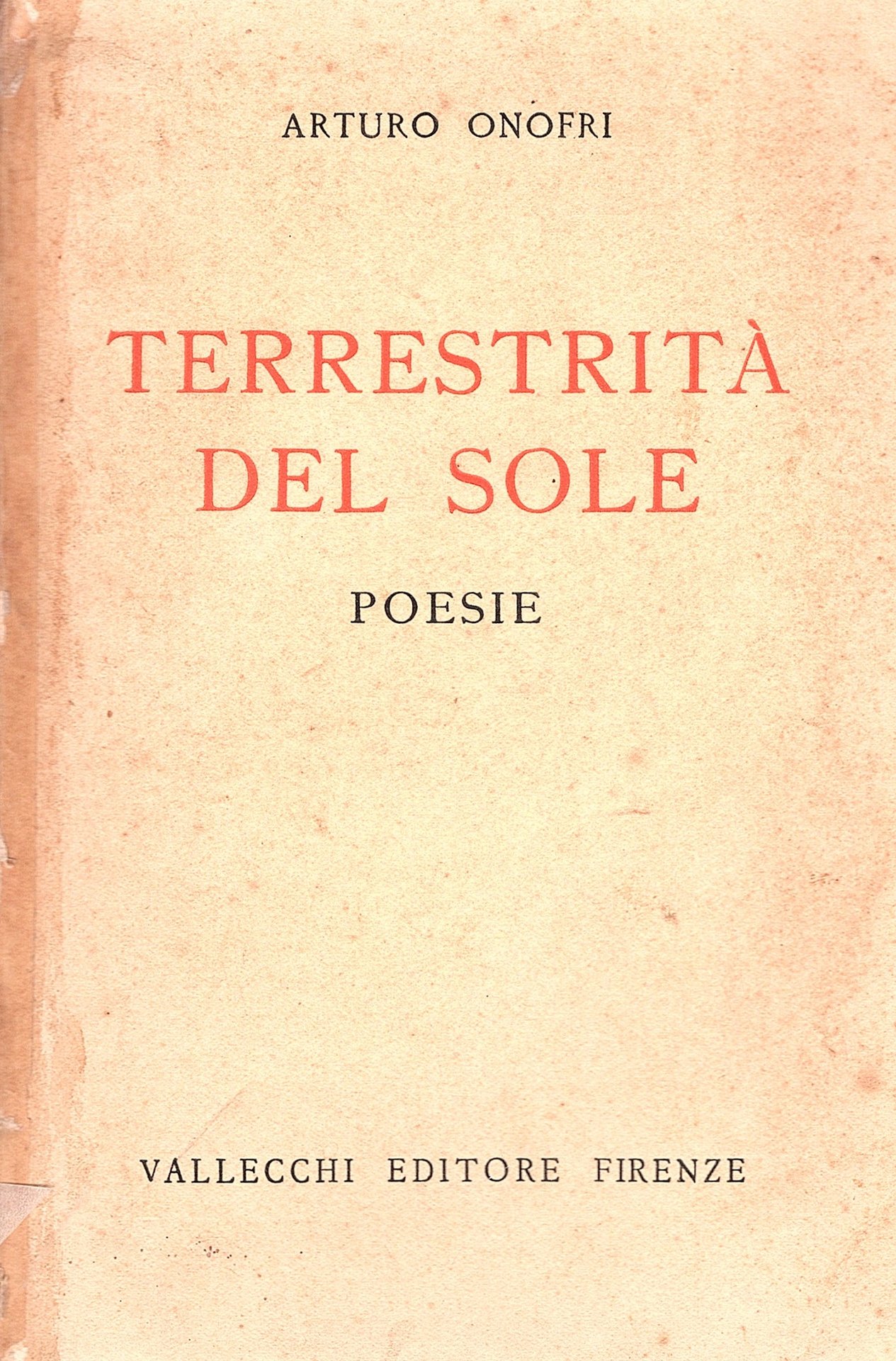 In-8°, pp. 238, (2), brossura editoriale. Firma a tampone di Onofri al verso del frontespizio. Una forma sul frontespizio e dorso con traccia di nastro. Velina. Prima edizione. 'Del 1927 è la pubblicazione dei 150 componimenti inclusi in Terrestrità del sole, che dà il nome al ciclo omonimo, il cui fine nelle idee dellautore era la costruzione concreta di un uomo universale. La raccolta, edita a Firenze da Vallecchi, fu recensita da Evola sulla rivista di studi religiosi Bilychnis dellagosto-settembre 1928.' (Gabriele Scalessa in D.B.I., LXXIX, 2013). Spaducci, p. 203. Gambetti / Vezzosi, p. 601: 'Non comune e piuttosto ricercato'.