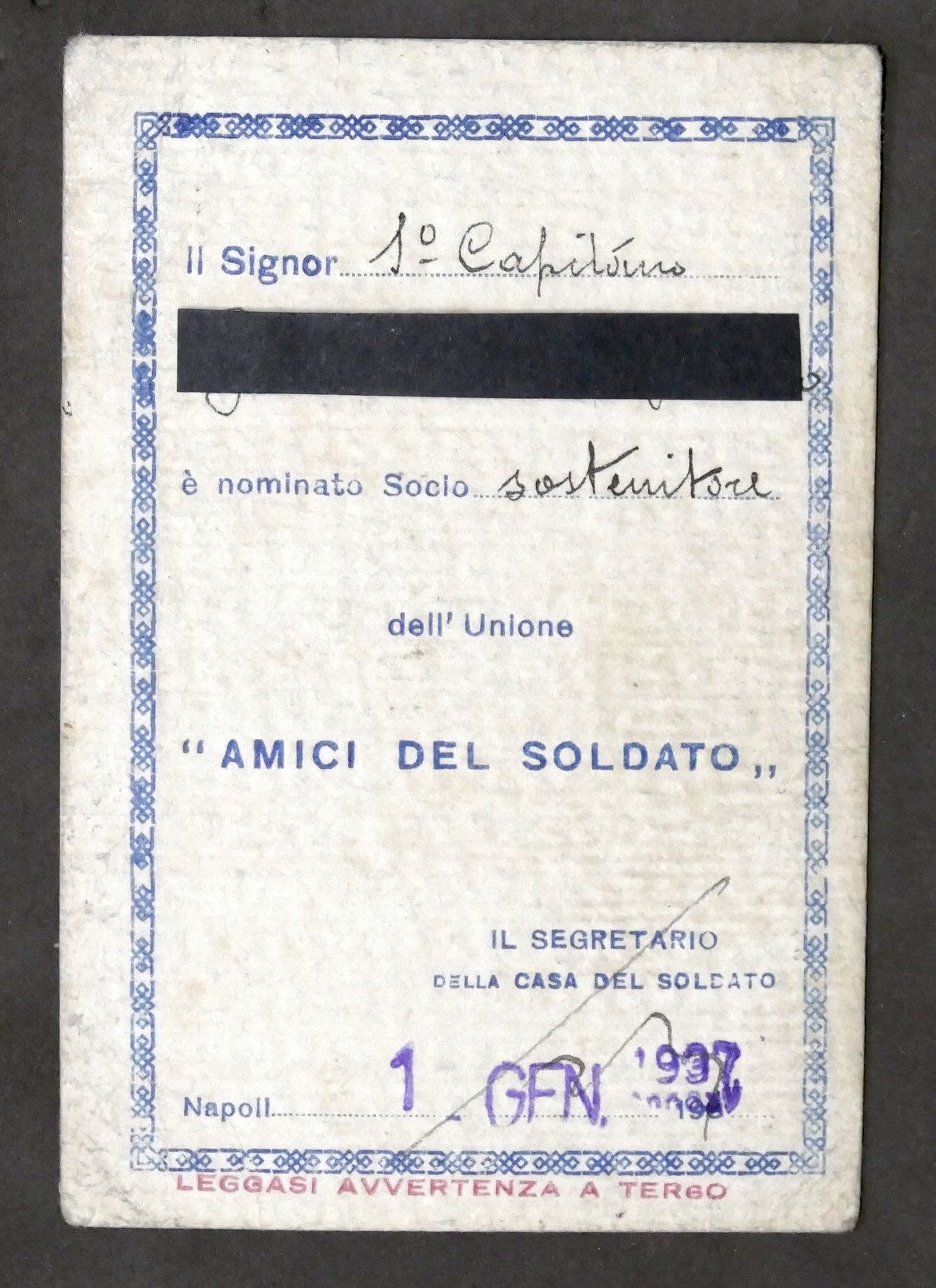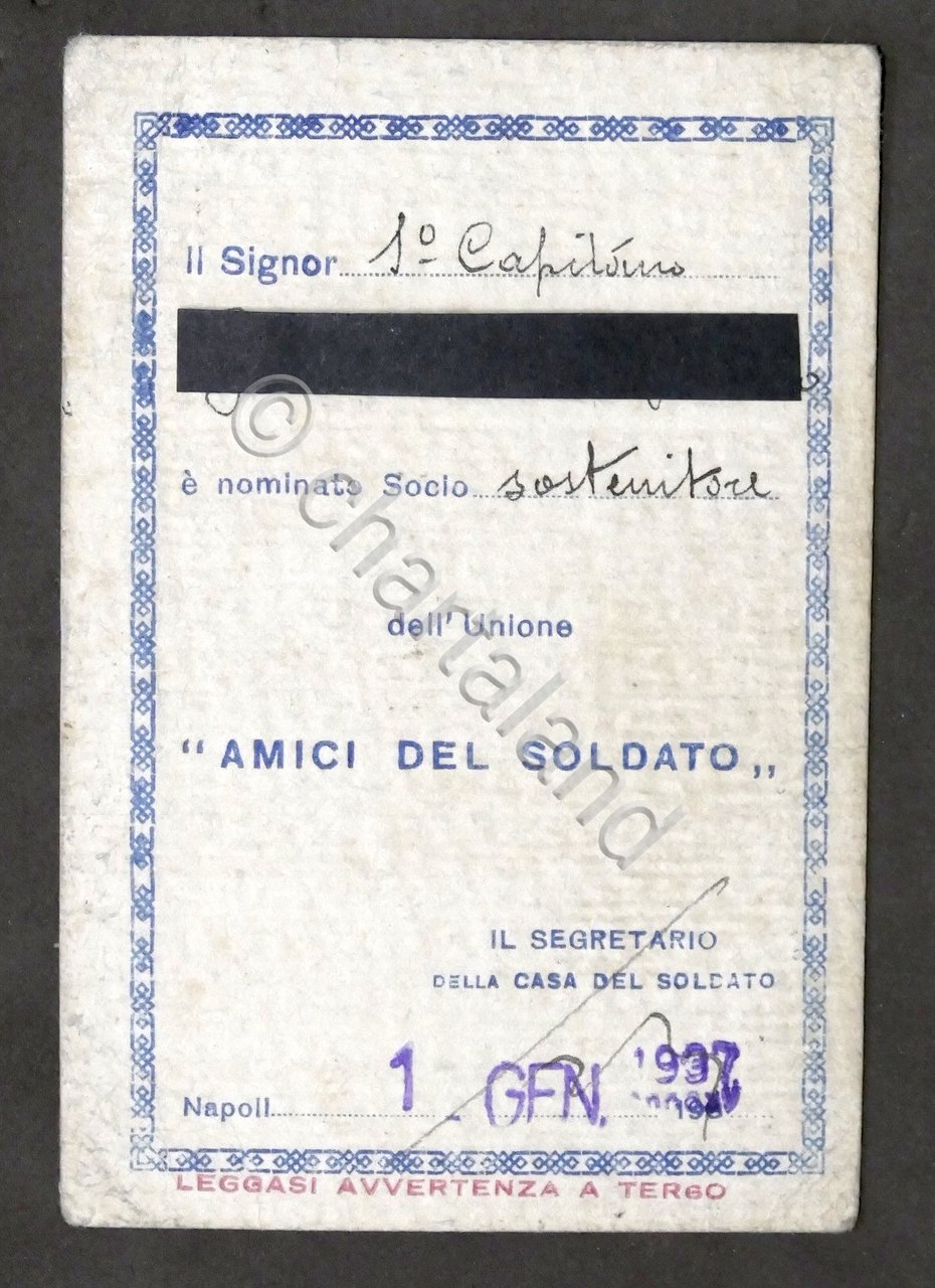 Tessera socio sostenitore Unione Amici del Soldato - Napoli - 1937