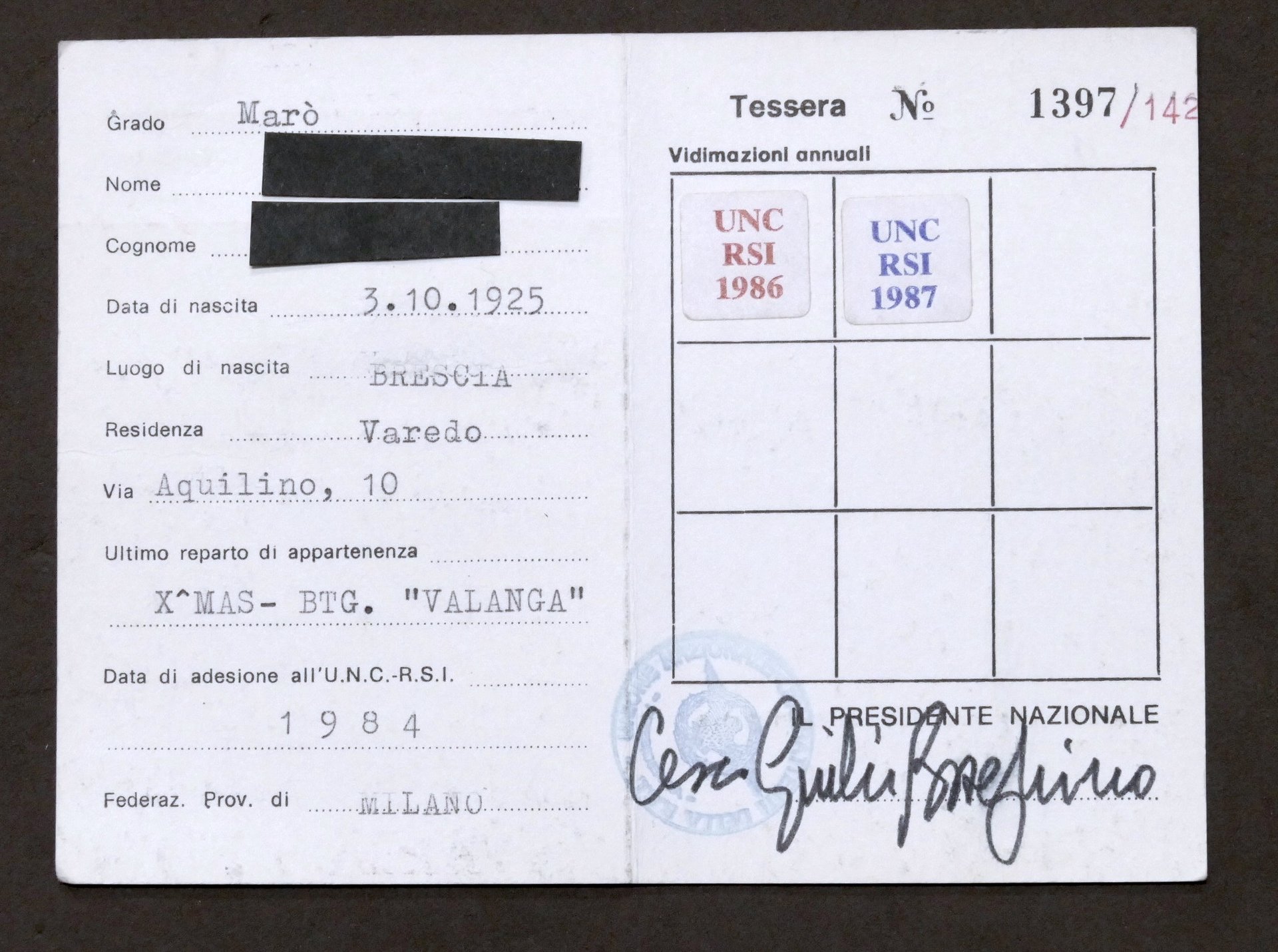 Tessera Unione Nazionale Combattenti Repubblica Sociale Italiana - ex Marò 1984 | Libri antichi e moderni |