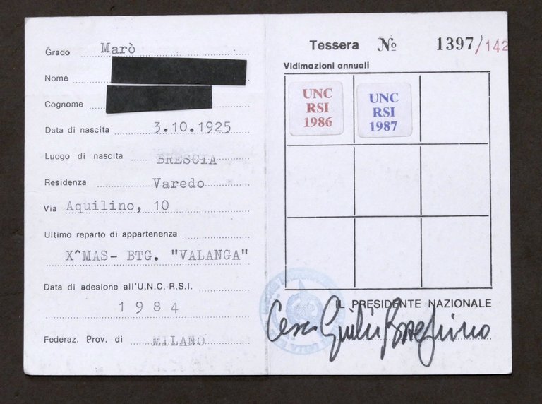 Tessera Unione Nazionale Combattenti della Repubblica Sociale Italiana - 1984 Ultimo Reparto di Appartenenza: X^ MAS - Btg. Valanga" - Grado Marò Dimensioni: 6 x 9 cm ca. Condizioni generali buone. Lievi pieghe come da foto.   "