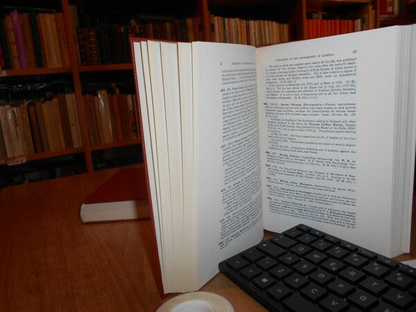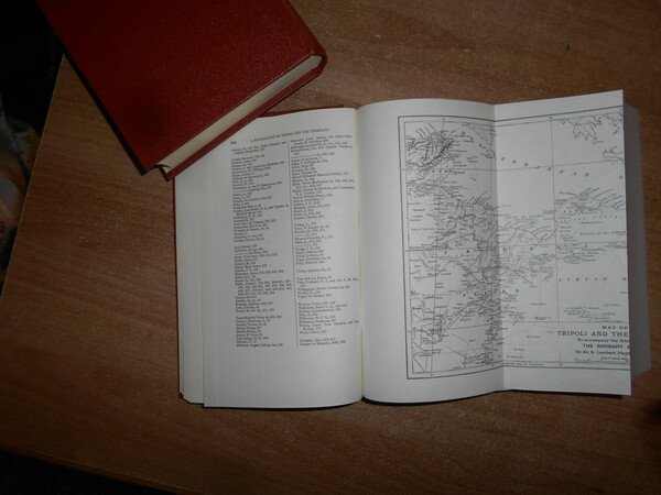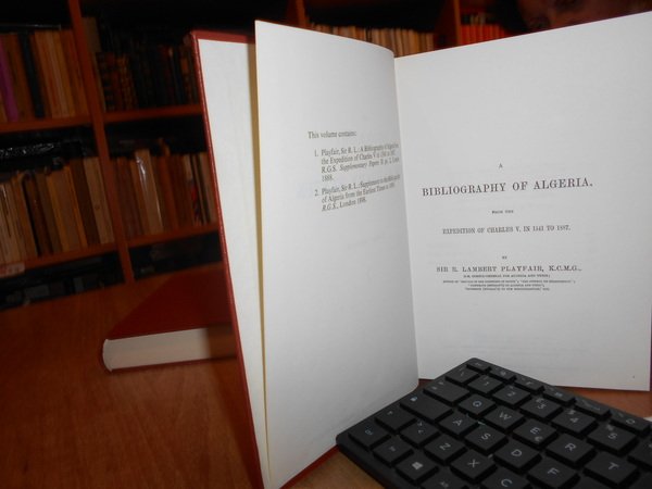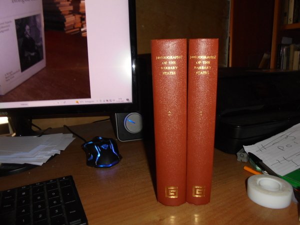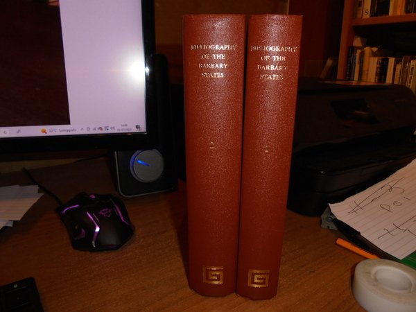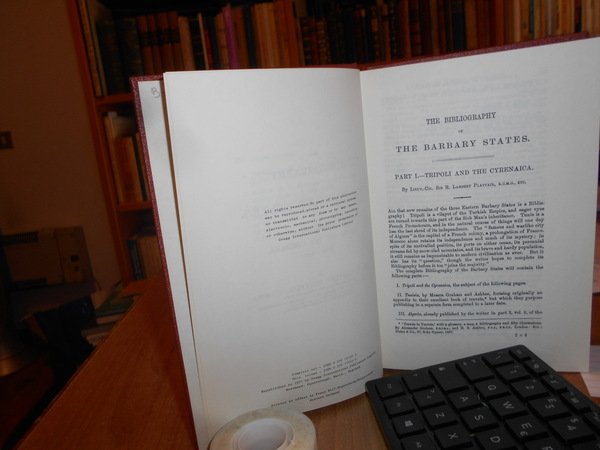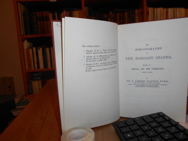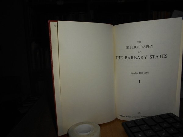 R. LAMBERT PLAYFAIR. England, Greg Intenational Publisher Limited, 1971. The Bibliography of THE BARBARY STATES. 2 volumi in-8° piccolo, tela edit. rossa con titoli in oro ai dorsi. Part. I. Tripoli and the Cyrenaica. (With a Map). da pag. 557 a pag. 614. 2. A Bibliography of Tunisia. to the 1888 (in two parts). 216 pp. A Bibliography of Morocco. 476 pp. A Bibliography of Algeria. da pag. 129 a pag. 430. Supplement to The Bibliography of Algeria. (iv), 321 pp. Completo. Esemplare come nuovo. Uff. B - I - 6