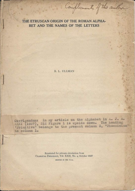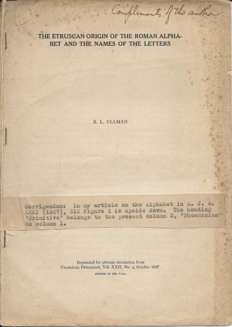THE ETRUSCAN ORIGIN OF THE Roman alphabet AND THE NAMES OF THE LETTERS (1927) | Libri antichi e moderni | Ullman B. L.