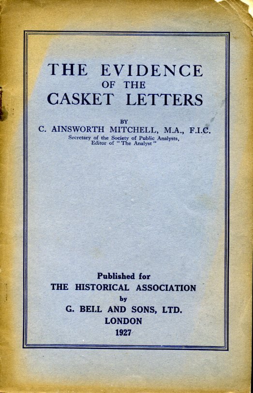 No marks or inscriptions. No creasing to covers. Clean tight pages in booklet form with rusty staples, slight loss to upper front corner and some sunning. 30pp. An account of the documents produced from the time of Mary Queen of Scots which purported to provide evidence that the Queen loathed her husband Darnley, and planned to marry Bothwell after being privy to the murder of her husband. These were known as the Casket Letters. Historical Association Leaflet No 67. Scarce.