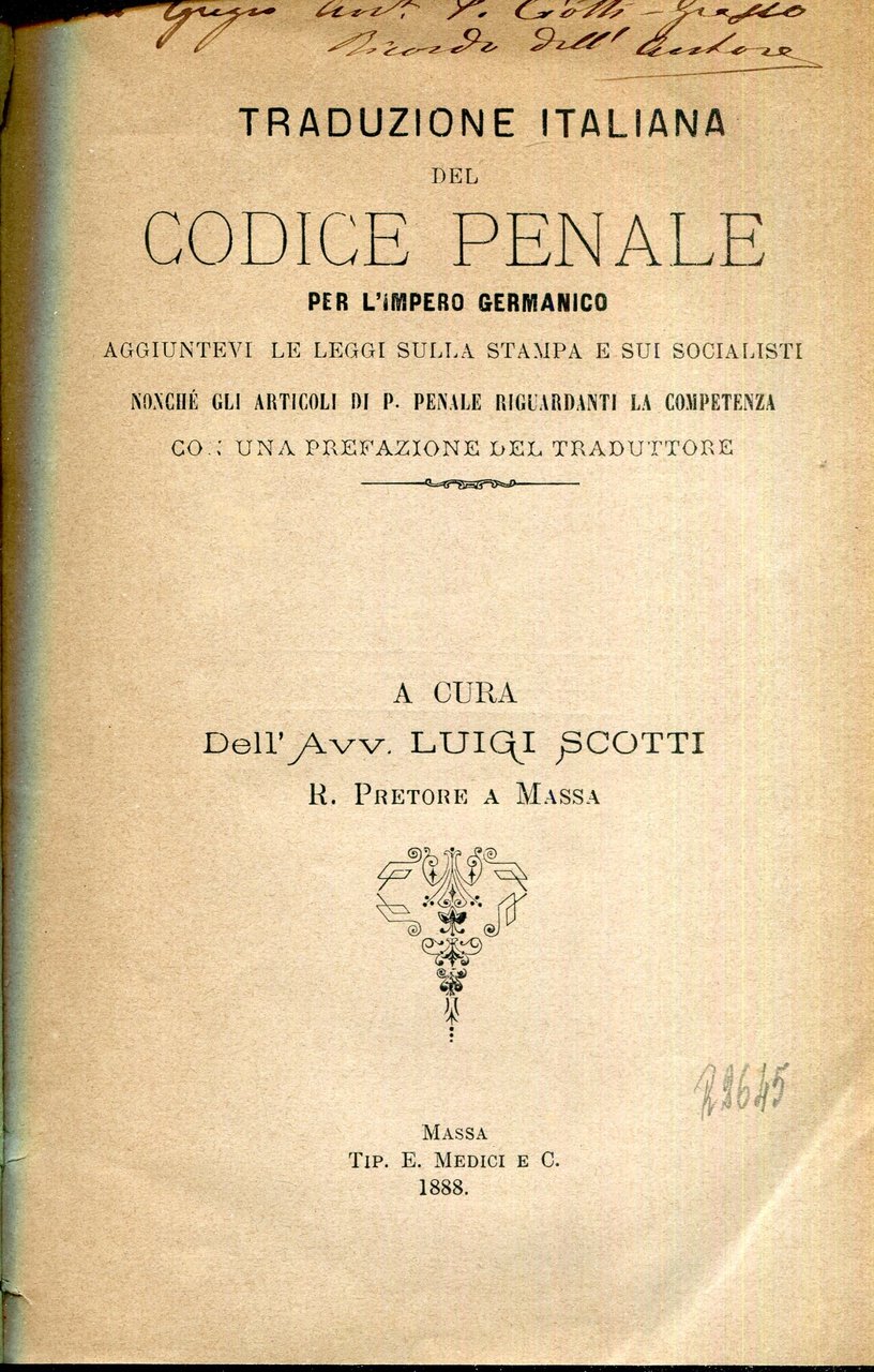 Traduzione italiana del Codice penale per l'Impero germanico, aggiuntevi le leggi sulla stampa e sui socialisti, nonche gli articoli di p. penale riguardanti la competenza con una prefazione del traduttore | Libri antichi e moderni | Scotti, Luigi, ,Scotti, Luigi