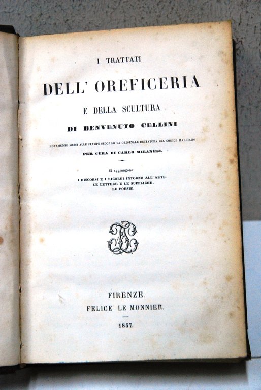 b. cellini trattati dell'oreficeria e della scultura nuovamente messi alle stampe secondo la originale dettatura del codice marciano. firenze le monnier 1857 .