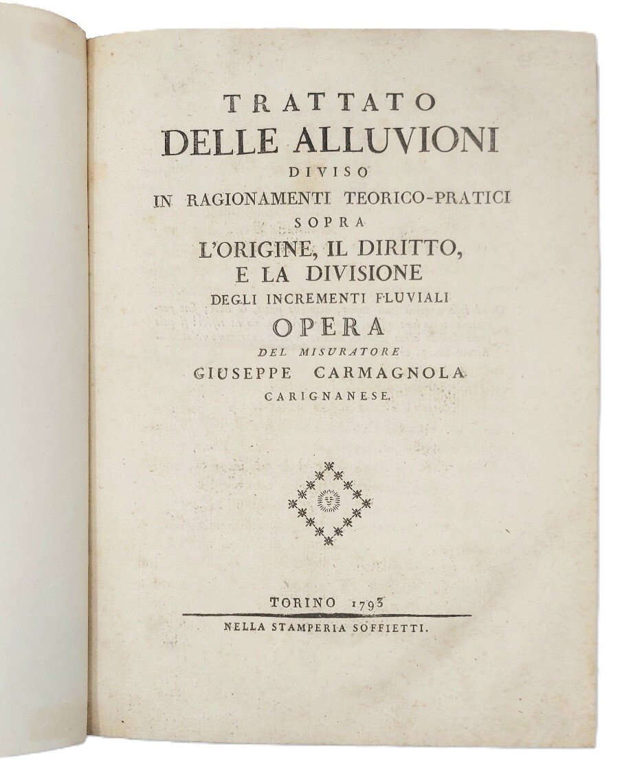 Trattato delle Alluvioni. Diviso in ragionamenti teorico-pratici sopra l'origine, Il diritto, e la divisione degli incrementi fluviali.  | Libri antichi e moderni | CARMAGNOLA, Giuseppe.