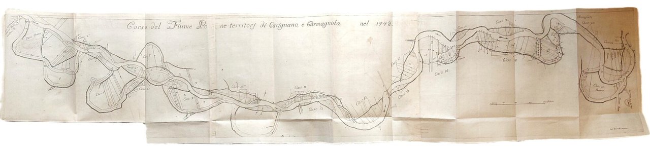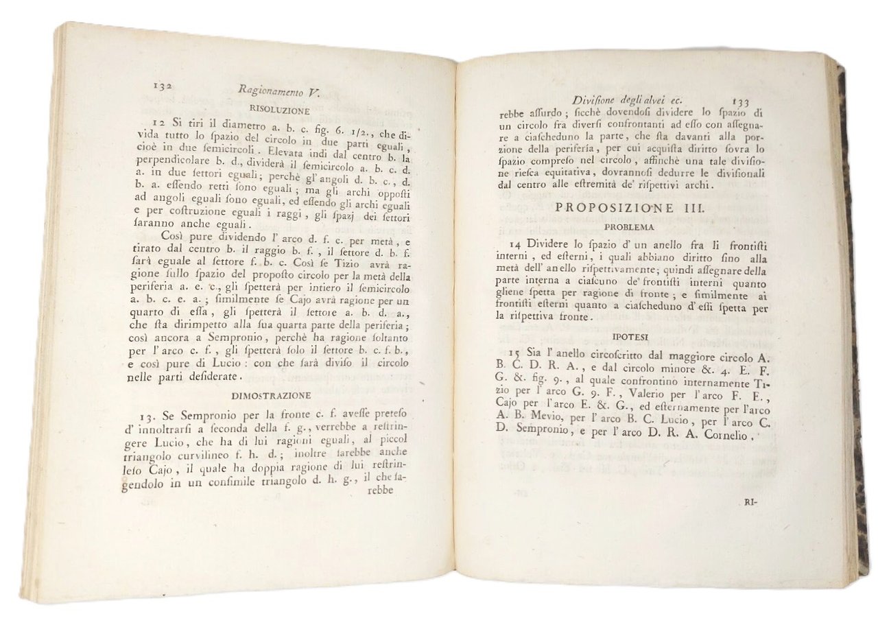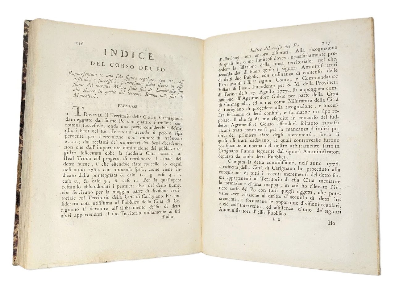 >in-4, pp. XVI, 254, (2), legatura del tempo mezza pelle, titolo e fregi oro al dorso (cerniere e cuffie rinforzate). Con 7 grandi tavole topografiche ripiegate fuori testo, inc. in rame, di cui una assai grande che raffigura nel dettaglio il corso del Po nei territori di Carignano e Carmagnola sino a Moncalieri. Importante trattato legale specifico settecentesco non comune: ''Raccolta di leggi relative al Diritto d'Alluvione desunte dal Corpo Civile a comodo delle persone non legali, e che servono di base al seguente Trattato''. Ottimo esemplare. (Manca alla Bibliografia Piemontese di Manno-Promis).