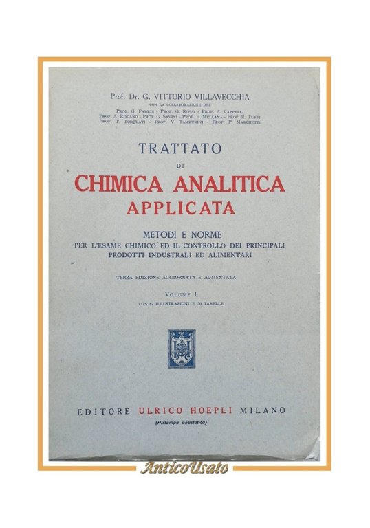 TRATTATO DI CHIMICA ANALITICA APPLICATA di Vittorio Villavecchia. Volume I. Metodi e norme per l'esame chimico ed il controllo dei principali prodotti industriali ed alimentari.Editore Ulrico Hoepli, 1948. Collana "Biblioteca Tecnica".XXIII + 916 pagine, 82 illustrazioni in bianco e nero nel testo, 50 tabelle. Copertina editoriale in brossura. Stato di conservazione: molto buono (pagine normalmente ingiallite)