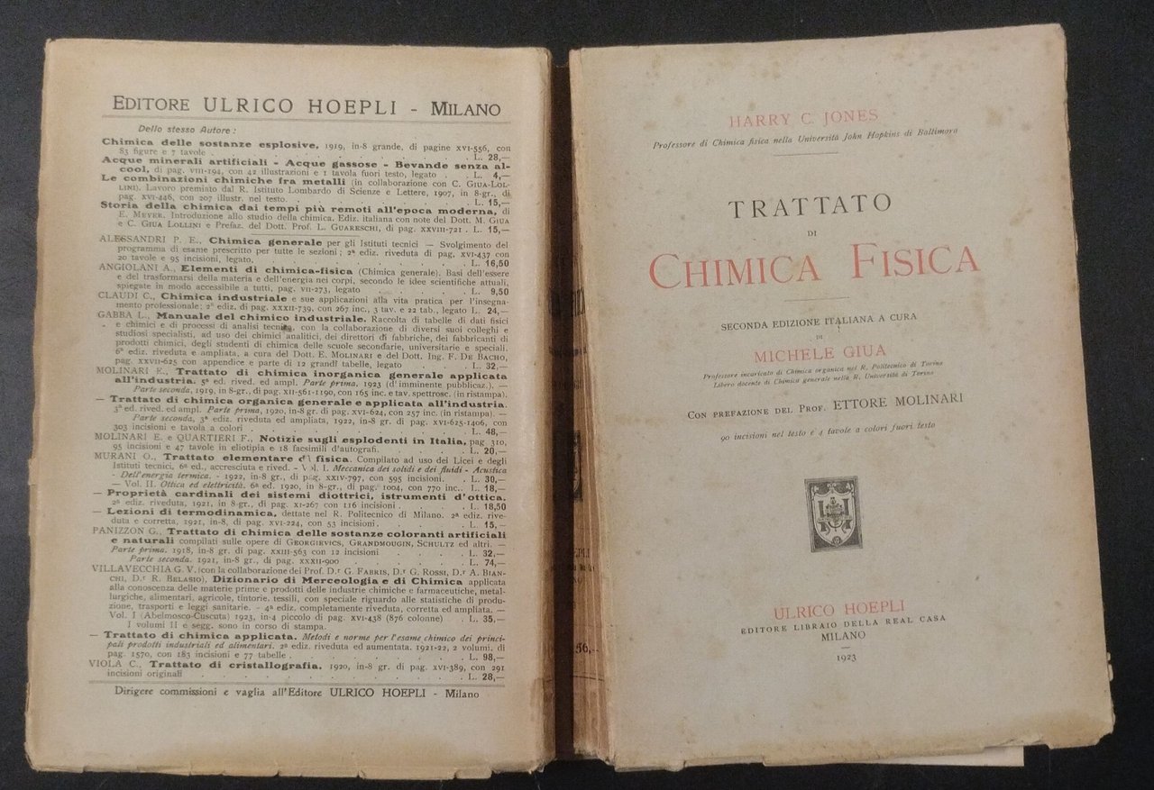 TRATTATO DI CHIMICA FISICA di Harry C. Jones. A cura di Michele Giua con prefazione del professore Ettore Molinari. Hoepli Editore, 1923 . XXIII, 733 pagine, Illustrazioni in bianco e nero nel testo. Copertina editoriale in brossura. Stato di conservazione: buono (pagine ingiallite, chiose e sottolineature a matita leggera, legatura leggermente allentata) Libro usato saggistica manuale