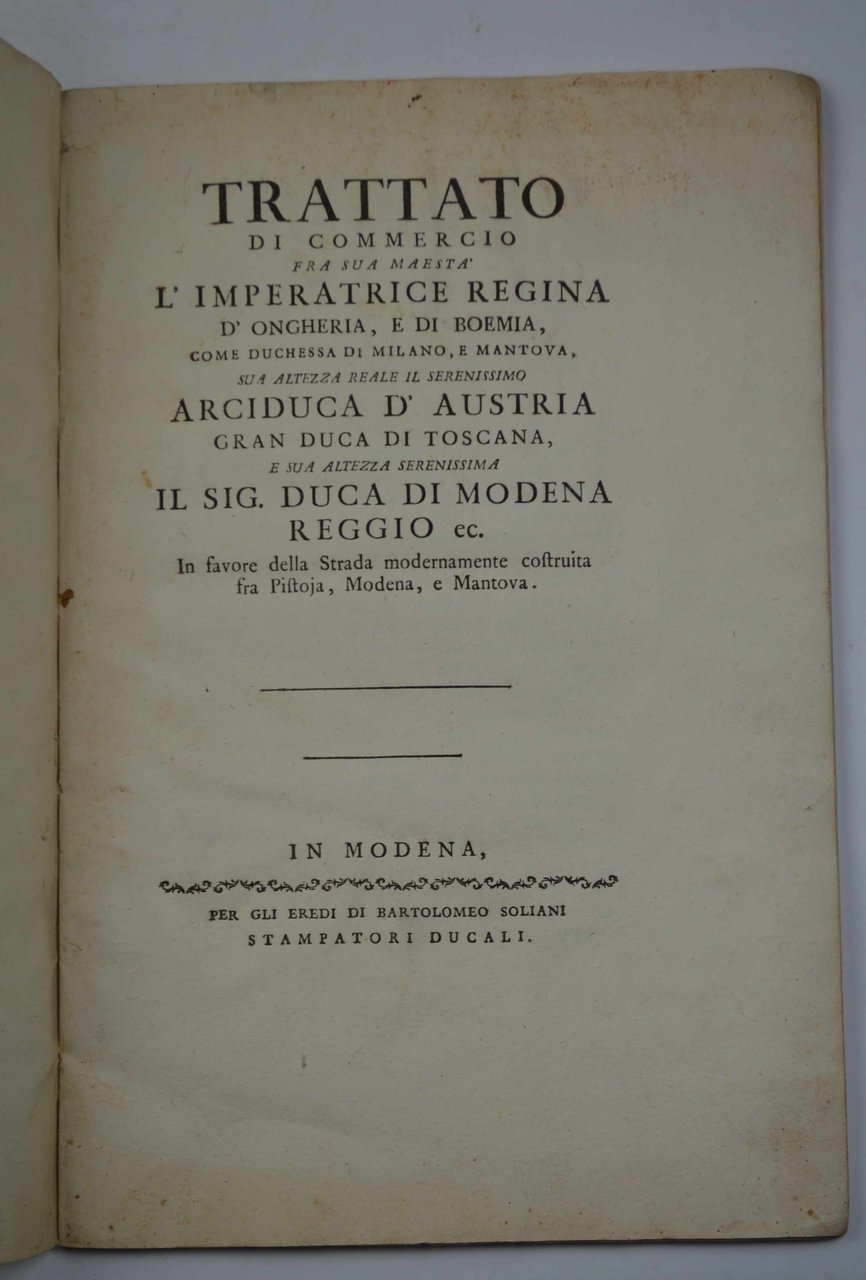 Trattato di commercio fra Sua Maesta l'Imperatrice Regina d'Ongheria, e di Boemia, come Duchessa di Milano, e Mantova, Sua Altezza Reale il Serenissimo Arciduca d'Austria Gran Duca di Toscana e Sua Altezza Serenissima il sig. Duca di Modena Reggio ec. in favore della strada modernamente costruita fra Pistoia, Modena e Mantova. | Libri antichi e moderni |