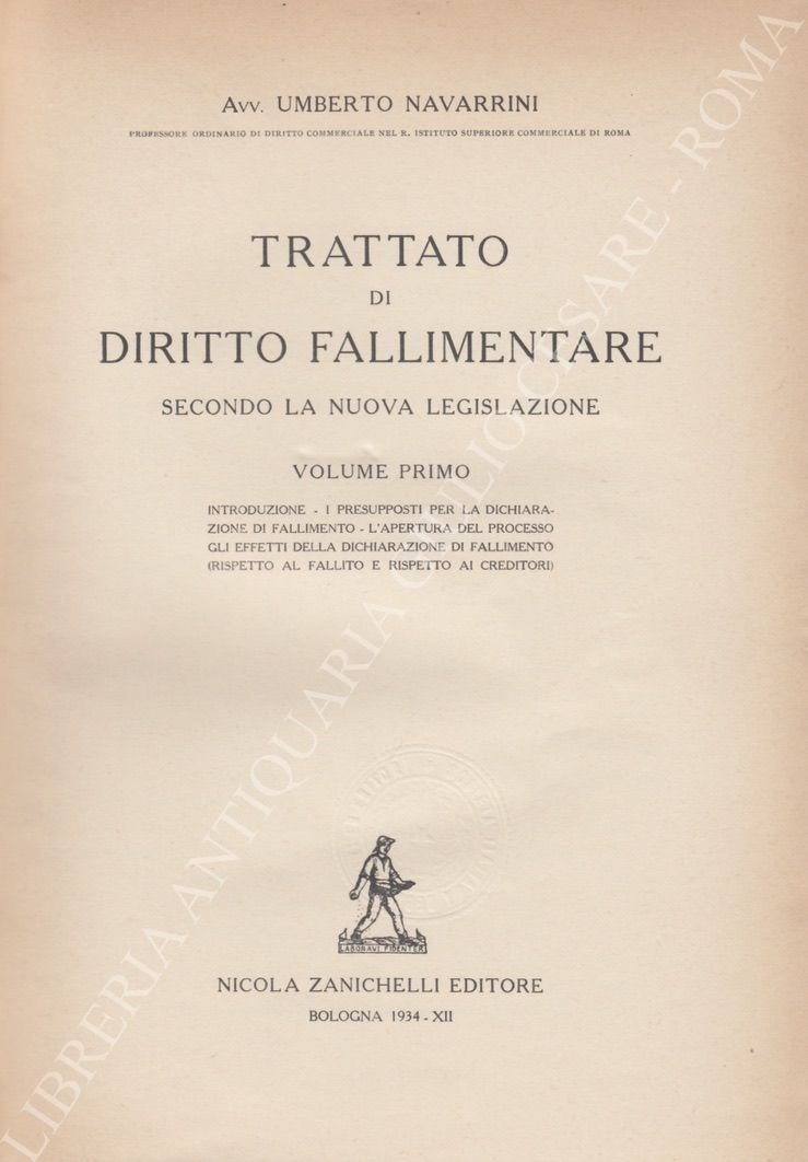 Trattato di diritto fallimentare secondo la nuova legislazione. Vol. I - Introduzione. I presupposti per la dichiarazione di fallimento. L'apertura del processo. Gli effetti della dichiarazione di fallimento (rispetto al fallito e rispetto ai creditori). Vol. II - Liquidazione. Ripartizione. Chiusura e cessazione del fallimento (concordato). Fallimento delle società commerciali. I reati in materia di fallimento. Concordato preventivo. Procedura dei piccoli fallimenti | Libri antichi e moderni | Navarrini Umberto
