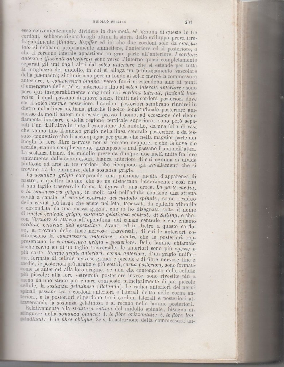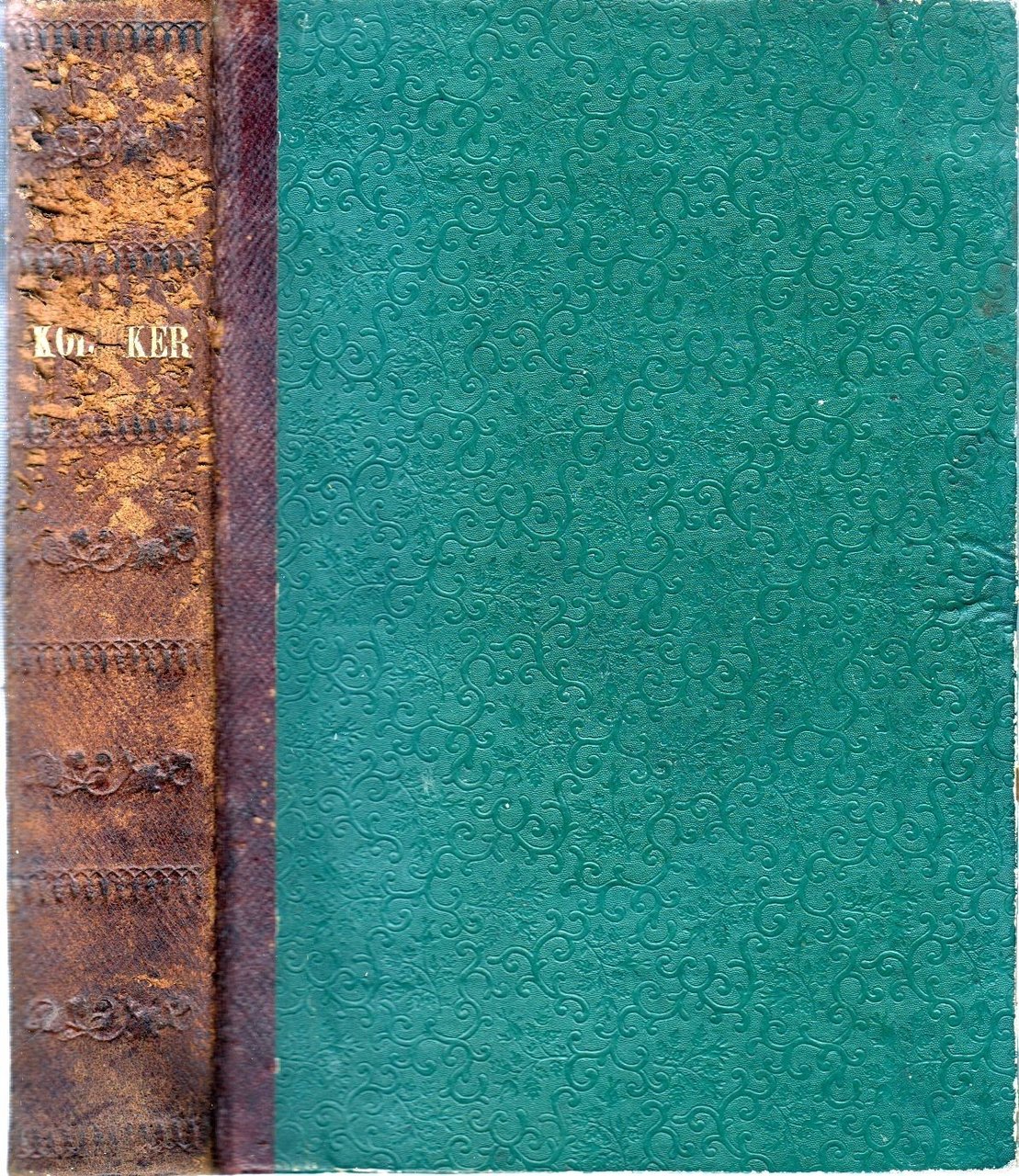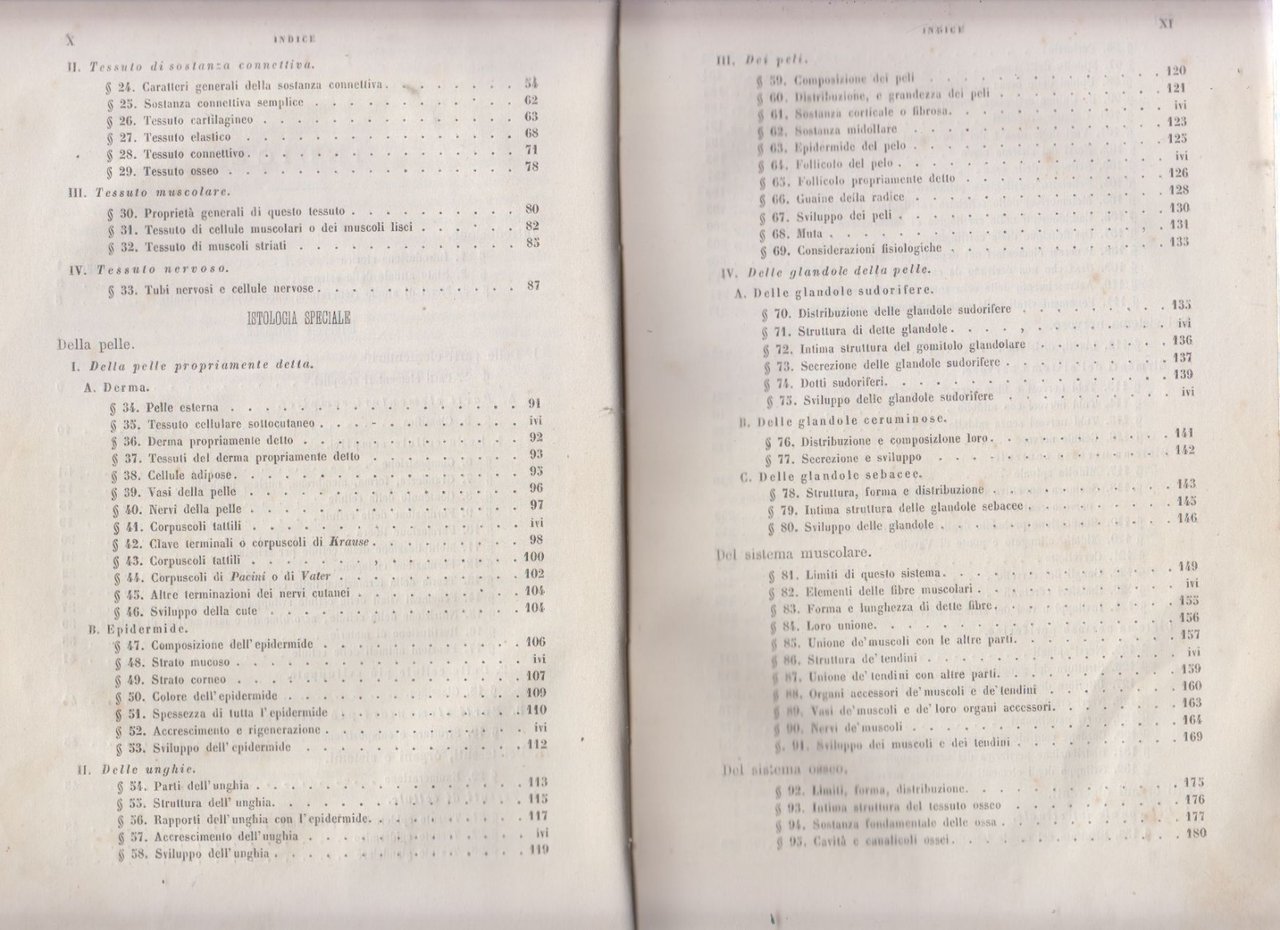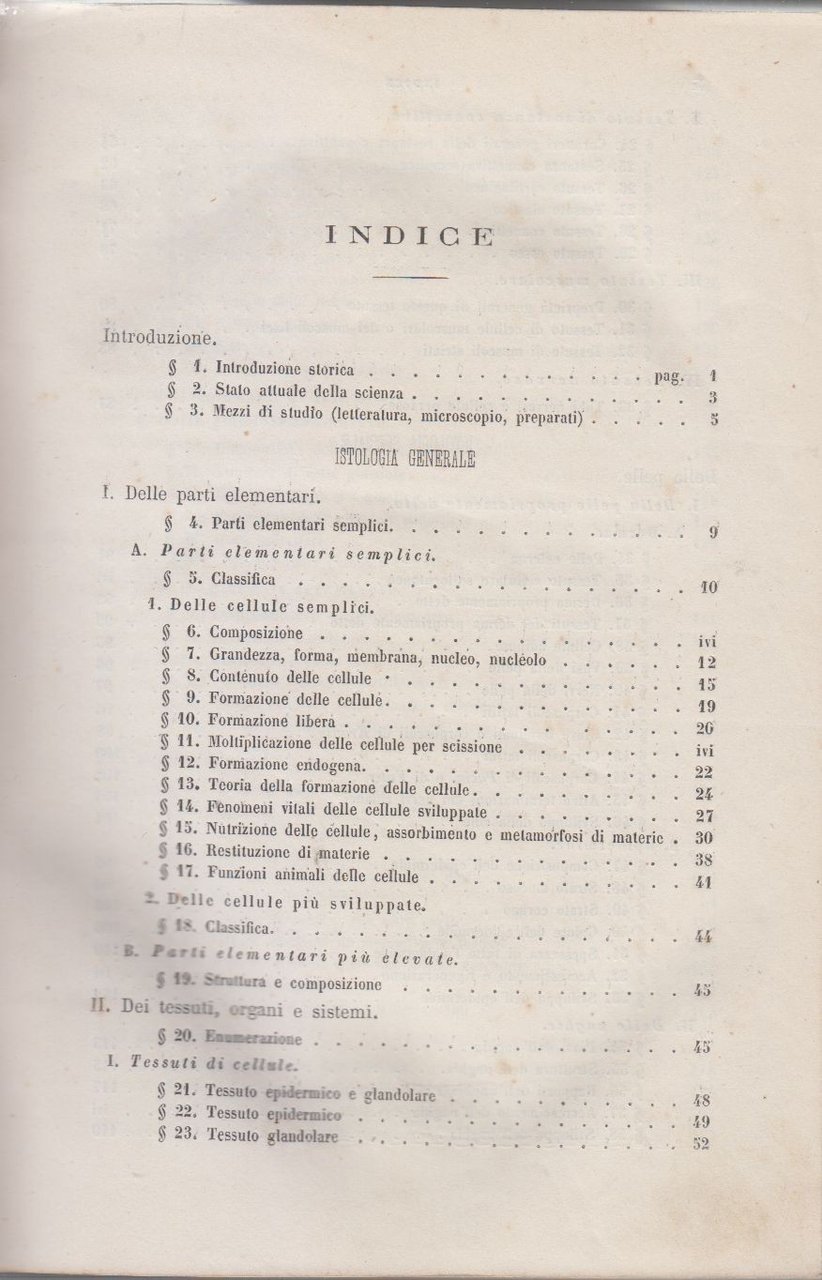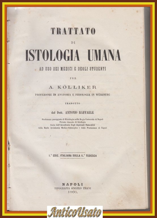 Copertina di fine ottocento in mezza pelle con piatti goffrati. Dimensioni: 16,5 x 23,5 cm. Stato di conservazione: molto buono (fioriture diffuse, brunitura al margine interno delle tavole, dorso sciupato con spellature).Importante trattato scientifico di istologia umana, opera del celebre anatomista e fisiologo A. Kölliker, professore all’Università di Würzburg. Si tratta della prima edizione italiana, tradotta sulla quarta edizione tedesca dal dott. Antonio Raffaele, docente di fisiologia e istologia presso la Regia Università di Napoli.Il volume rappresenta uno dei testi fondamentali per la diffusione dell’istologia moderna in Italia nella seconda metà dell’Ottocento, testimoniando il passaggio dalla medicina descrittiva alla ricerca microscopica dei tessuti.Opera di interesse storico-medico, adatta a collezionisti, studiosi di storia della medicina e biblioteche specializzate.