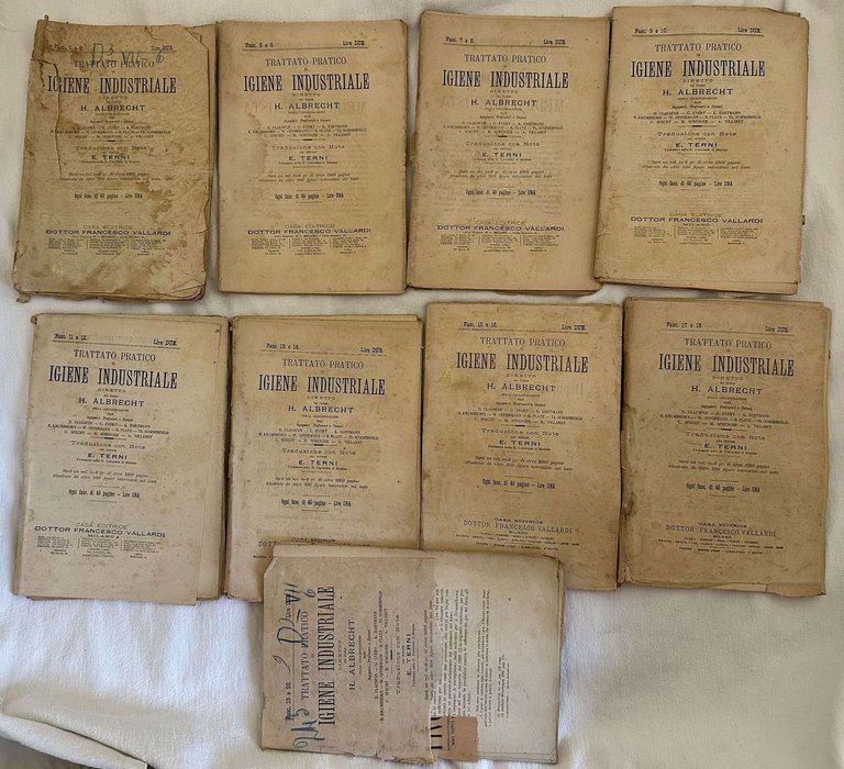 Trattato di igiene industriale di H. Albrecht. Senza data ma della fine dell'ottocento. Traduzione con note del Dottor E. Terni. Alcune illustrazioni all'interno. L'opera è suddivisa in dispense. Purtroppo la dispensa n. 3 e 4 (pp dalla 81 alla 160) risultano mancanti e dalla 800 alla 1097. Risulta mancante inoltre il frontespizio. Tra gli argomenti trattati: Natura e importanza dei danni cagionati dalle industrie (malattie prodotte dalla polvere e la tubercolosi, effetti dannosi agli operai, Costruzione e disposizioni architettoniche delle fabbriche e degli opifici, Sicurezza contro gli incendi in generale, Impianti di latrine, modo di rendere la polvere innocua, spogliatoi lavaoti e bagni, Ambienti di soggiorno per gli operai durante il riposo, caldaie a vapore, apparecchi di difesa, servizio degli apparecchi motori, apparecchi di trazione o argani, ascensori, fabbriche di accumulatori, oggetti di metallo, industria delle pietre e delle terre ecc. In discrete condizioni. Copertina editoriale in discrete condizioni generali con lievi usure ai margini e dorso . Legatura editorialmente assente. All'interno le pagine si presentano in ottime condizioni con rare fioriture. In 8. Dim. 24,5x17 cm. Pp. 80, 161-400, 417-800.Treaty of industrial hygiene by H. Albrecht. Not dated but of late 19th century. Translation with notes by E. Terni. Some illustrations inside. The work is divided in instalments. unfortunately instalment n. 3 and 4 (pages from 81 to 160) are missing and from 800 to 1097. the title page is missing. The issues treated: Natura e importanza dei danni cagionati dalle industrie (malattie prodotte dalla polvere e la tubercolosi, effetti dannosi agli operai, Costruzione e disposizioni architettoniche delle fabbriche e degli opifici, Sicurezza contro gli incendi in generale, Impianti di latrine, modo di rendere la polvere innocua, spogliatoi lavaoti e bagni, Ambienti di soggiorno per gli operai durante il riposo, caldaie a vapore, apparecchi di difesa, servizio degli apparecchi motori, apparecchi di trazione o argani, ascensori, fabbriche di accumulatori, oggetti di metallo, industria delle pietre e delle terre ecc. In fair conditions. Editorial cover in fair conditions lightly worn in the extremities. Binding is editoriarly missing. Pages are in good conditions with occasional foxing. In 8. Dim. 24,5x17 cm. Pp. 80, 161-400, 417-800.