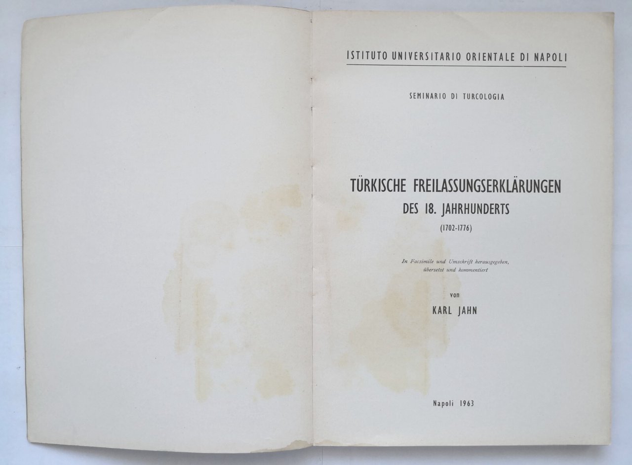TÜRKISCHE FREILASSUNGSERKLÄRUNGEN DES 18. JAHRHUNDERTS (DICHIARAZIONI DI RILASCIO TURCO XVIII SECOLO) (1702-1776) di Karl Jahn. Seminario di Turcologia.
