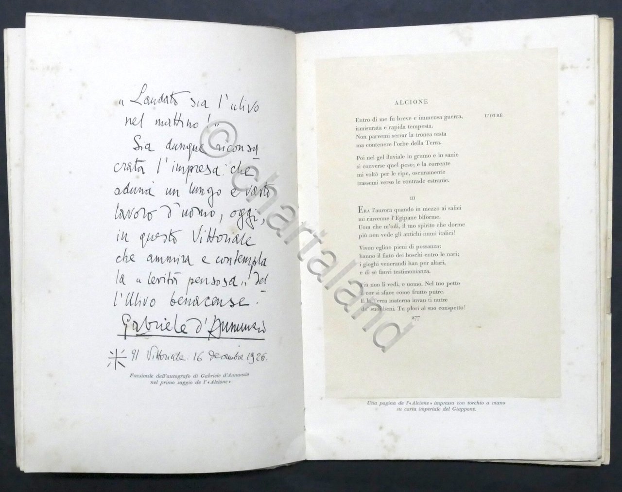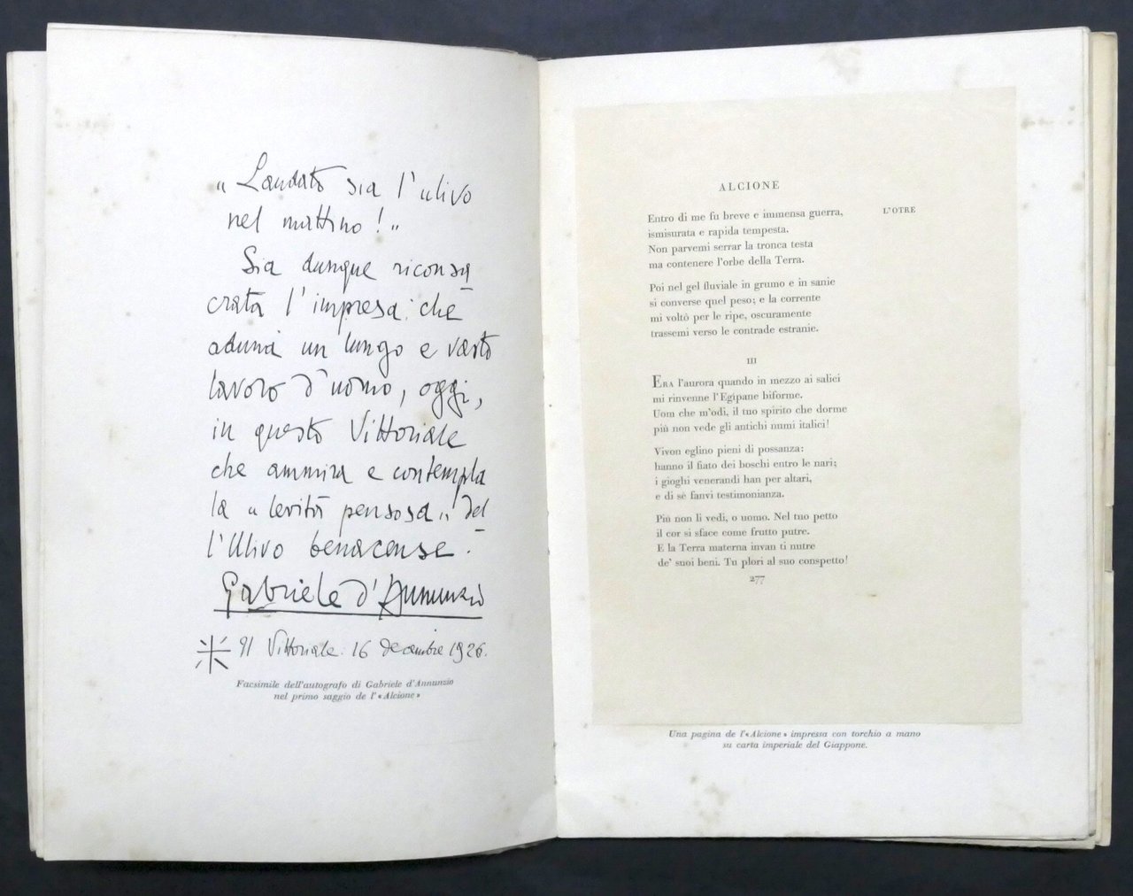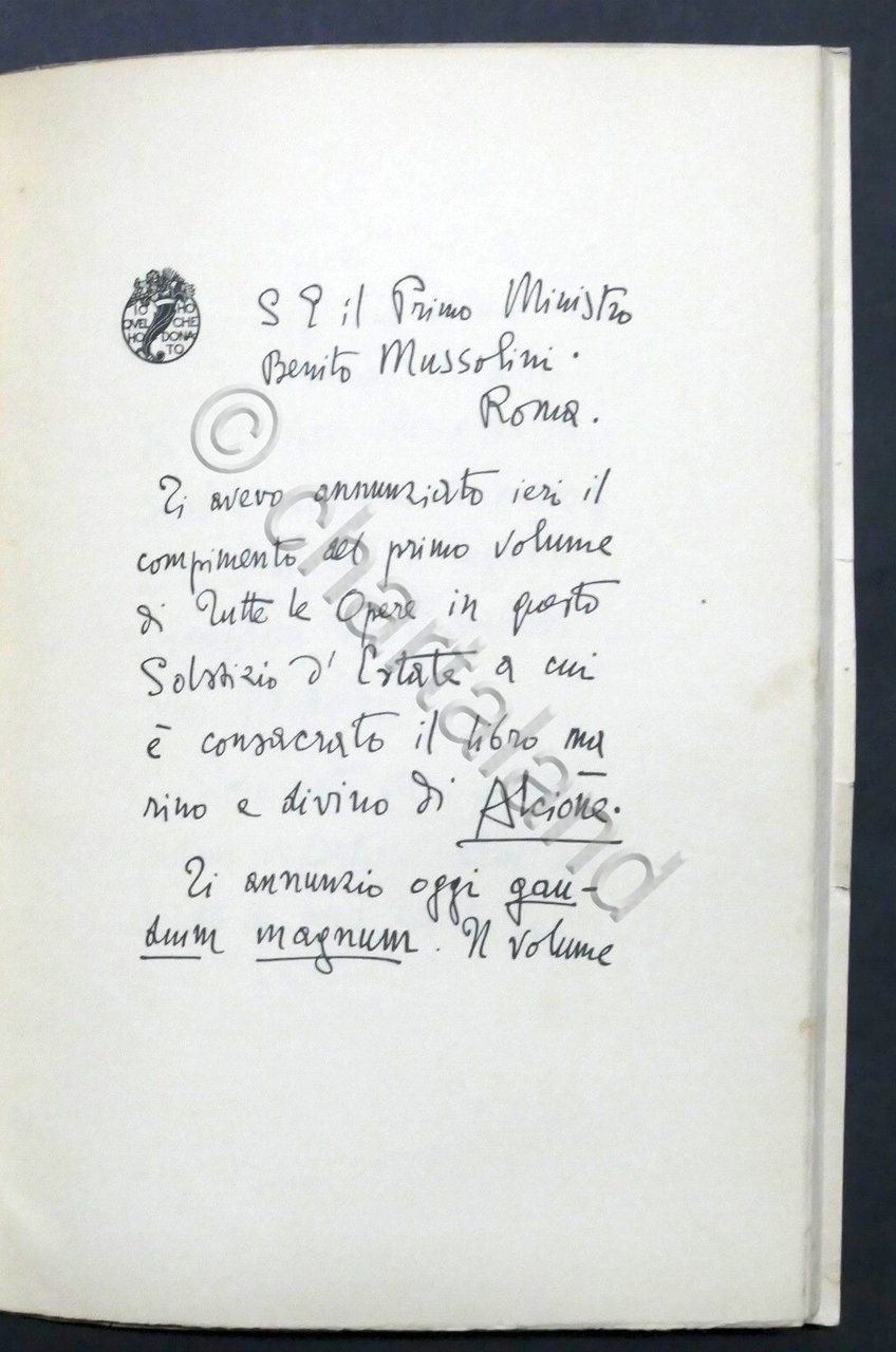 Tutte le opere di Gabriele D'Annunzio - ed. 1927 Mondadori Pag. 107 con illustrazioni, facsimili e fotografie fuori testo. Copertina morbida; dorso e copertina posteriore rifatti. Lingua italiana. Buone condizioni generali. Tracce di foxing naturale.