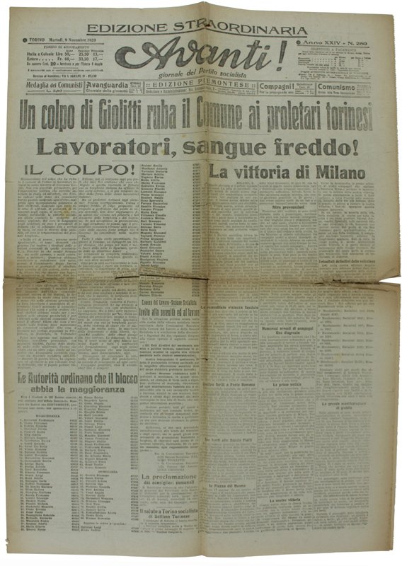 UN COLPO DI GIOLITTI RUBA IL COMUNE AI PROLETARI TORINESI. Lavoratori, sangue freddo! Grande titolo: AVANTI !, 9 Novembre 1920. | Libri antichi e moderni |