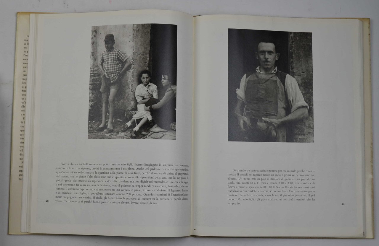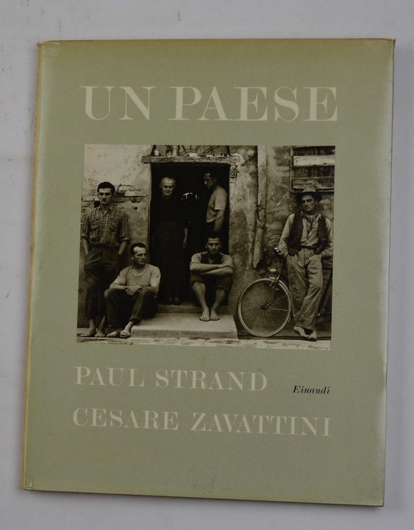 Cm. 29, pp. 104 (2). Con 88 splendide fotografie in bianco e nero di Paul Strand. Leg. edit in tela con sovracoperta illustrata. Una piccola dedica ms. alla prima carta bianca. Una minuscola mancanza al margine della sovracoperta del piatto anteriore, peraltro ottimo stato di conservazione. Prima edizione, ricercata e ormai poco reperibile, di uno dei più celebri libri fotografici italiani del '900, straordinaria documentazione visiva sul paese natio di Zavattini, Luzzara, in provincia di Reggio Emilia, e sulla sua pittoresca umanità. Narra Zavattini: Nel 1954 il famoso fotografo e cineasta americano Paul Strand venne a Roma da lontano e disse: Facciamo un libro insieme? Lo abbracciai, lo portai a Luzzara, ve lo lasciai a lungo con i suoi occhi giusti e una macchina antica a treppiede. Fu così che nel 1955 Einaudi pubblicò Un paese. In quell'anno (1955), l'ambiente dei fotografi fu turbato in Italia da altri fatti: la maestosa rassegna The Family of Man, curata da Steichen per il Museum of Modern Art di New York e due volumi d'immagini, Un paese di Paul Strand e New York di William Klein. Attorno a questi due episodi si coalizzarono le tendenze della nostra fotografia (qualcuno trovò anche conferme, specialmente in The Family of the Man e in Un paese), che cominciò a dimenticare le iniziative autarchiche, sia pure sollecitanti, come quelle de La Bussola e degli altri circoli, per seguire opportunamente le tracce indicate dalle correnti mondiali, che potevano ora essere configurate nell'opera di tre maestri: Steinert, Strand (una lezione di partecipante realismo, nella tradizione delle ricerche americane sullo specifico tra gli anni '20 e '30), Klein (Zannier, 1986, p. 304). Italia mia. Collezione diretta da Cesare Zavattini, 1 [unico volume pubblicato della collana]. Gambetti / Vezzosi, p. 999. Open Book, 162-163. Auer, 359. Russo, Storia culturale della fotografia italiana, passim. Italiano.