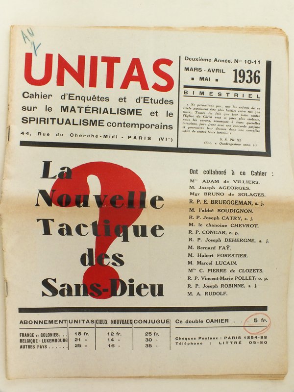 Unitas. Cahier d'Enquêtes et d'Etudes sur le Matérialisme et le Spiritualisme contemporains. Deuxième Année. Mars - Avril - Mai 1936 N° 10-11 : La Nouvelle Tactique des Sans-Dieu | Libri antichi e moderni | Collectif, Bruno De Solages, Mgr, Congar, R.P.