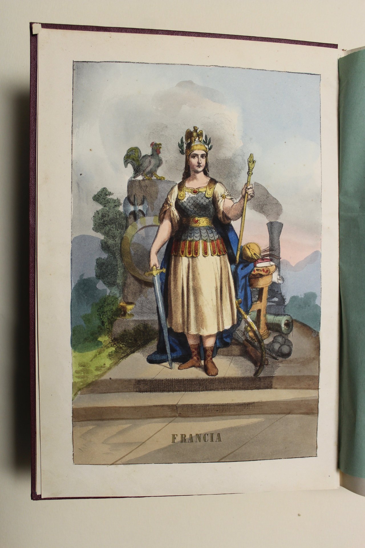 In 8° grande (285x195), pagg. 558, (3) con 53 tavole fuori testo, di cui 26 in silografia e 27, compreso il frontespizio allegorico, in cromolitografia, raffiguranti usanze indigene e costumi. Percallina moderna. Volume relativo a Francia, Inghilterra, Austria, Russia, Turchia, Prussica e confederazione germanica. Piacevole opera che descrive storia, storia naturale, usi e costumi arricchita da un ricco apparato iconografico. Perfettamente conservato.