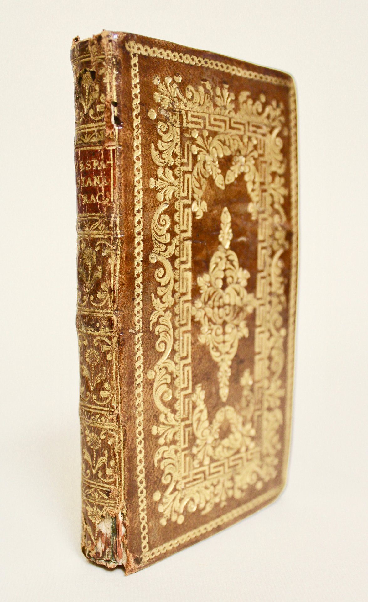 In 16°; pagg. 225, (3). Marca tipografica al frontespizio e fregi silografici. Splendida legatura in piena pelle coeva, piatti decorati con ricchi fregi e bordurine intrecciate, dorso a scomparti titolo su tassello e ricchi fregi floreali tutto in oro. Bell'esemplare con piccola mancanza alla cuffia inf. e usura agli spigoli.