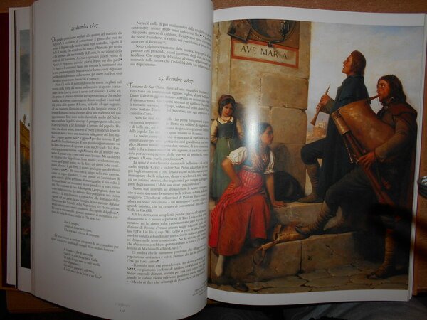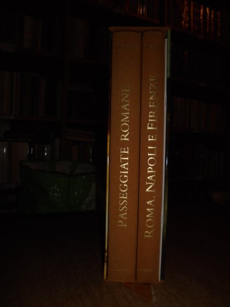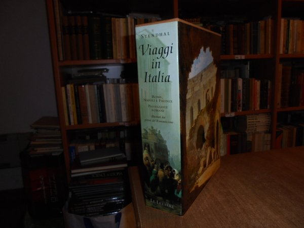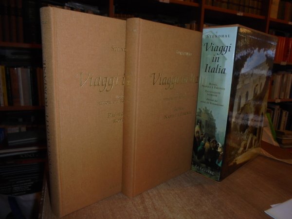 STENDHAL. Firenze, Casa Editrice Le Lettere, 2002. VIAGGI IN ITALIA, ILLUSTRATI DAI PITTORI DEL ROMANTICISMO. Introduzione di Massimo Colesanti. 2 volumi in-4° grande (34 x 25 cm.), stoffa marrone con titoli impressi in oro sui piani e ai dorsi + fascicolo con note al testo. di 39 pp. Passeggiate Romane. 418, (1) pp.; Roma, Napoli e Firenze. 290 pp. I due volumi sono corredati da magnifiche riproduzioni a colori la maggior parte a piena pagina, alcune a doppia pagina n.t. Perfetto esemplare pari al nuovo nel cofanetto in m. tela ill. a col. Uff. stanz. antic. mob. 14