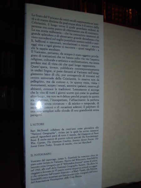 Touring Club, 1991. VIAGGIO IN VATICANO. Testi di Bart McDowell. Prefazione di Gian Paolo Melzi d' Eril. Fotografie di James L. Stanfield. In-4°, tela rossa con fregi e titolo in oro. Sovracopertina ill. a colori. 232 pp. Con belle e numerose illustrazioni a colori anche a piena e doppia pagina. Come nuovo. Neg. sotto Hoepli