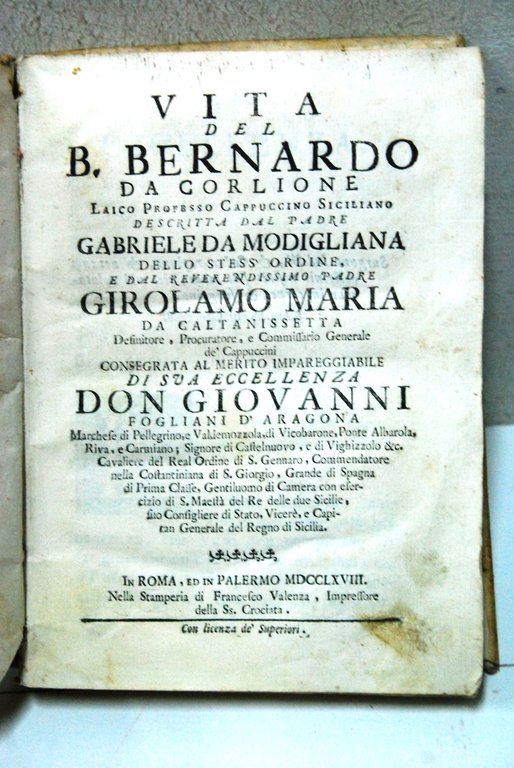 gabriele da modigliana vita del bernardo da corlione cappuccino siciliano girolamo maria da caltanissetta don giovanni fogliani d'aragona. palermo 1768 .