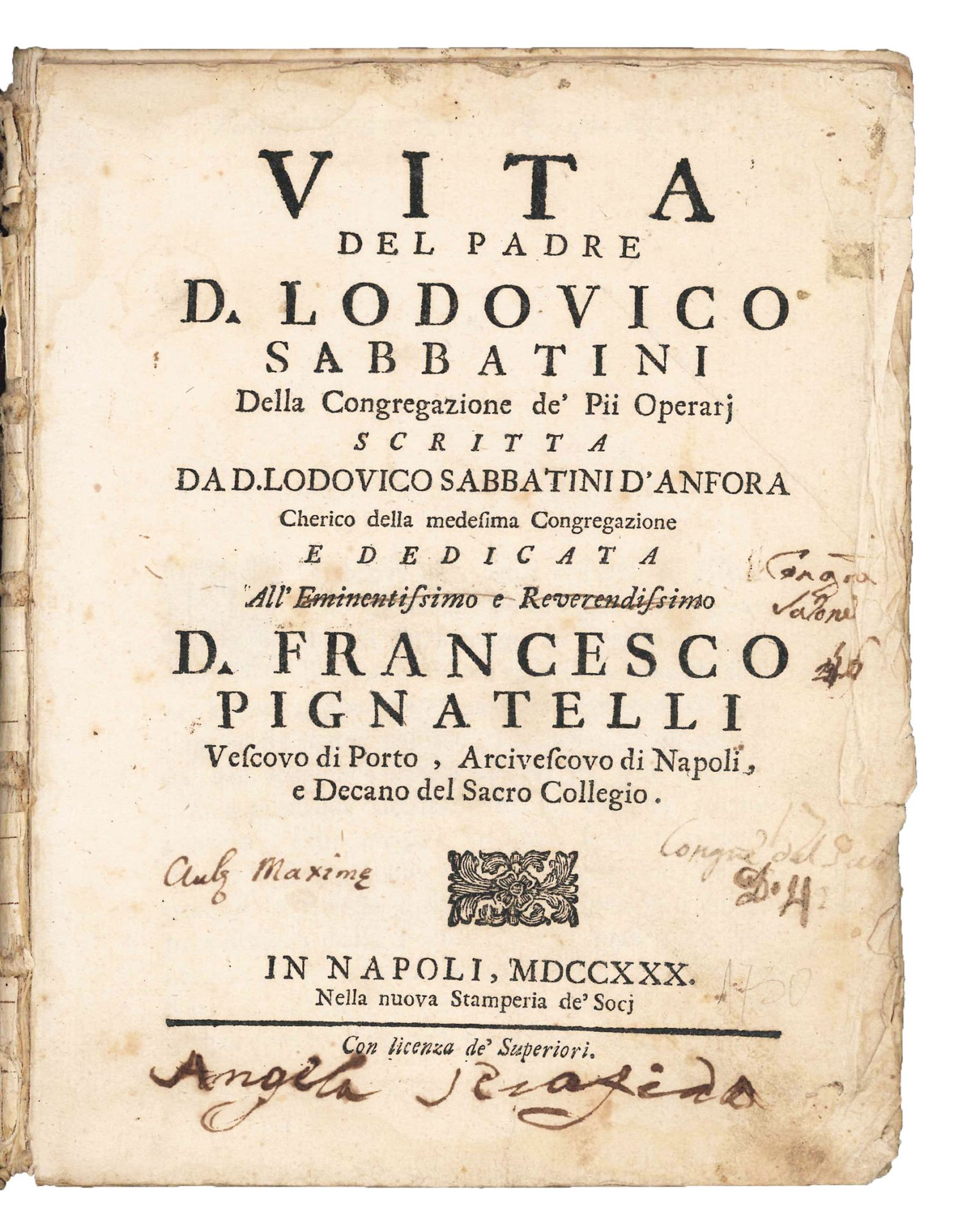 4to (mm. 224x170). Segnatura: a-b⁴ A-Iii⁴. Pp. [16], 434, [6]. Iniziali xilografiche ornamentali alle cc., esemplare in barbe. Cc. occasionalmente sporche o con piccoli tarli, primo fascicolo parzialmente staccato dal corpo del testo. Fregio ornamentale xilografico, firma di possesso ('Angela Serafida' o 'Jerafida') e annotazioni manoscritte al frontespizio. Pergamena rigida, titolo manoscritto al dorso (piatti lievemente sporchi, piccole mancanze alle cuffie, legatura parzialmente staccata dal corpo del testo). Prima edizione completa di questa biografia dell'omonimo Lodovico Sabbatini che comprende la vita, opere, poteri prodigiosi e miracoli del Religioso napoletano Ludovico Sabbatini (1650 -1724), fondatore della Congregazione dei Pii Operai di Iesi e beatificato da Papa Clemente XIII nel 1765.