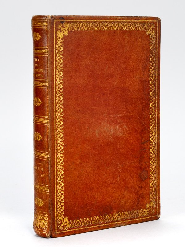 Pubblicata sull'edizione accuratissima di Girolamo Gigli, 1 vol. in-8 reliure de l'époque plein veau brun, dos lisse orné, toutes tranches dorées, Tipografia "Libreria Pirotta" e C., Milano, 1842, VII-246 pp., 1 f. blanc, 223 pp. avec un portrait ajouté (P.Fontana inc., in Roma presso A. Franzetti) Bel exemplaire (infimes frott.), enrichi d'un bel ex-dono de Mgr Clément Villecourt (1787-1867), Evêque de La Rochelle (1836-1856) : "A Mademoiselle Euphémie de Saint Légier, Souvenir de mon voyage d'Italie. La vie de Sainte Catherine de Sienne, trouvée à Gènes, le portrait de la Sainte trouvée à Rome où le livre a été relié. Rome le 5 juillet 1843". Clément Villecourt fut à l'origine d'un fort renouveau catholique dans son diocèse et se fit connaître par la vigueur de ses polémiques avec les protestants