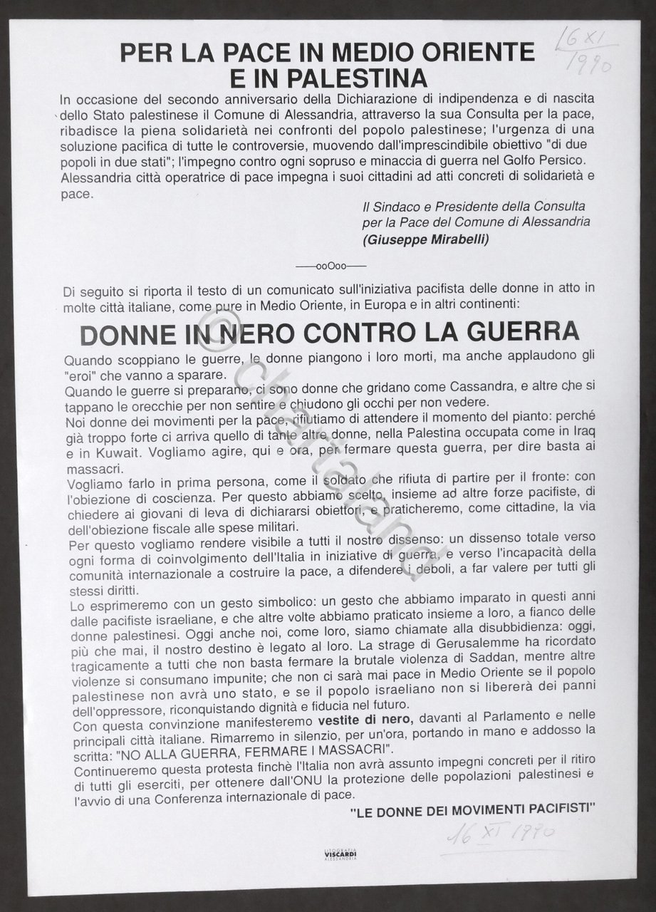 Volantino Le Donne dei Movimenti Pacifisti - Consulta per la Pace del Comune di Alessandria - Gruppo di Lavoro per la Palestina Manifestazione per la Pace in Medio Oriente e in Palestina - 1990 Un foglio stampato fronte/retro, dimensioni: 21,5 x 30,5 cm ca. Lingua italiana. Condizioni generali molto buone.