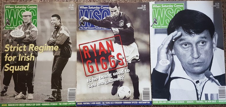 Three copies. No marks or inscriptions. No creasing to covers. Three very clean very tight copies with bright unmarked boards and no bumping to corners. Total of 106pp. Issues for December 1993, July 1994 and December 1994. Articles on young Alex ferguson, Northampton Town, Leyton Orient, Ipswich, Norwich, Birmingham, United, Middlesborough, Brighton and much much more. Tucked in iis an unused set of 28 WSC coloured humorous stickers from the 1994 World Cup.