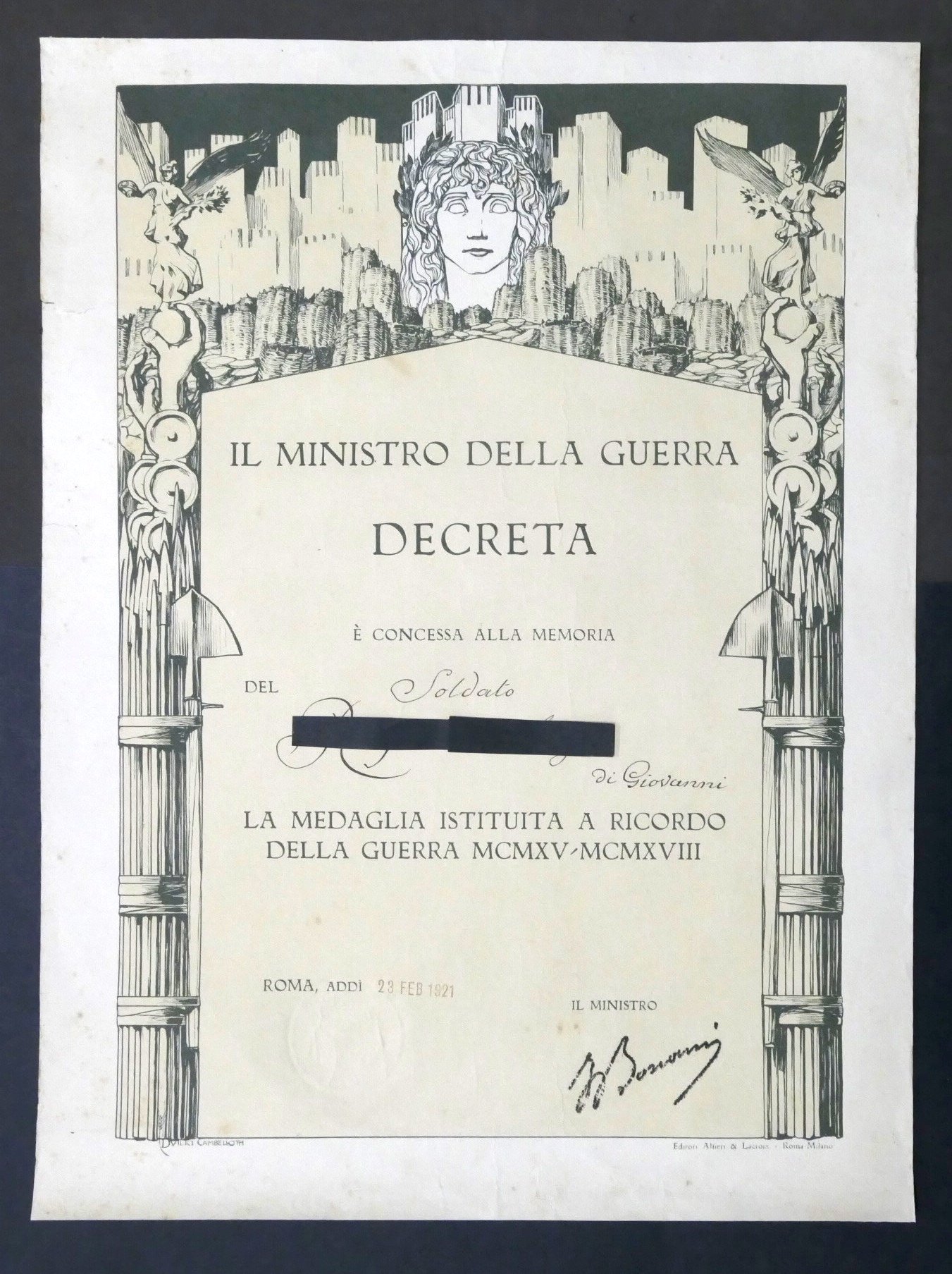 WWI - Decreto concessione alla memoria del soldato... la medaglia istituita a ricordo della guerra 1915-1918 - Datato Roma, 23 Febbraio 1921 Dimensioni: 35 x 47 cm ca. Lingua italiana. Condizioni generali buone. Piccolo strappo al bordo sinistro.