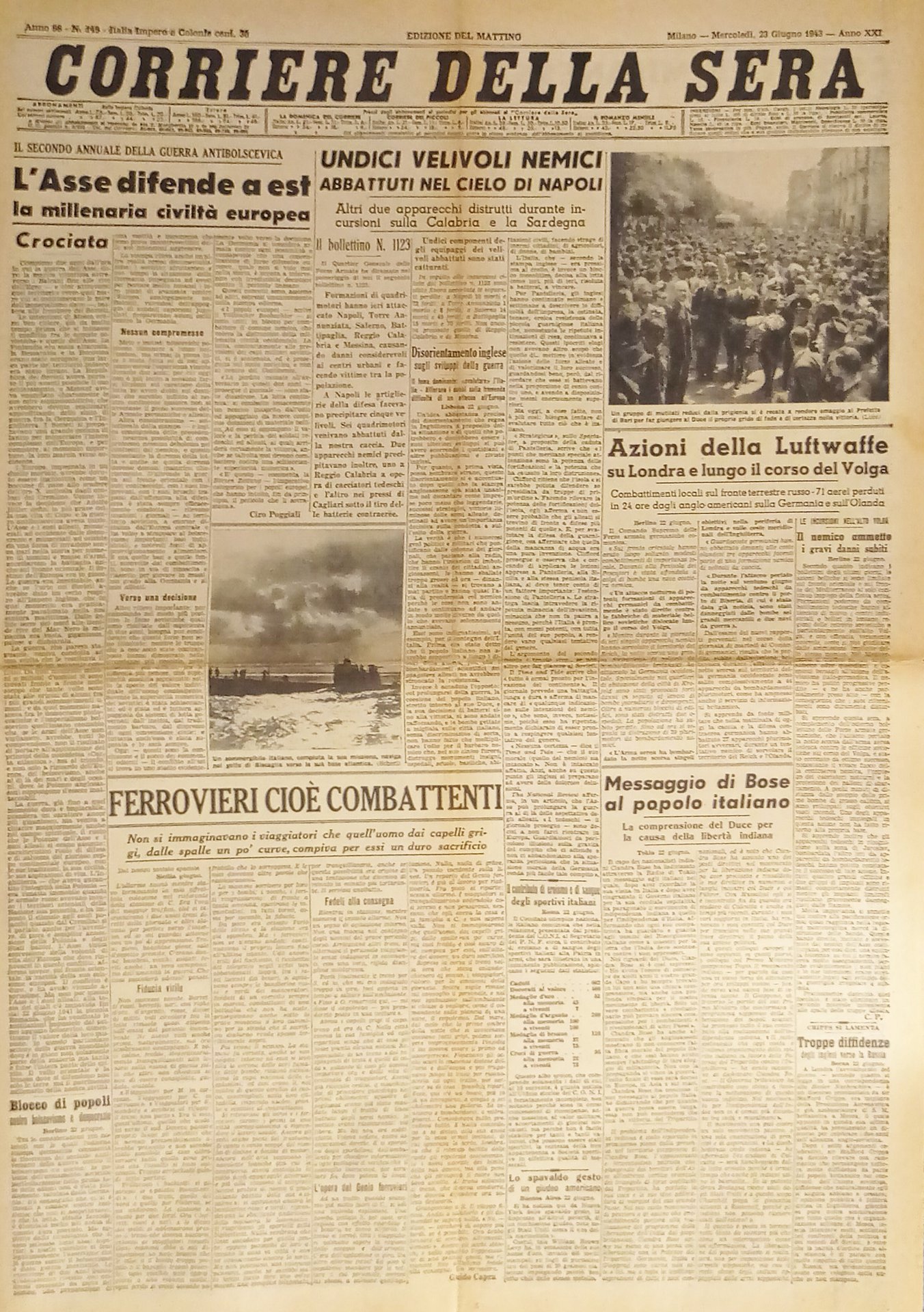 WWII - Corriere della Sera N. 149 - 1943 L'Asse difende a est la civiltà europea
