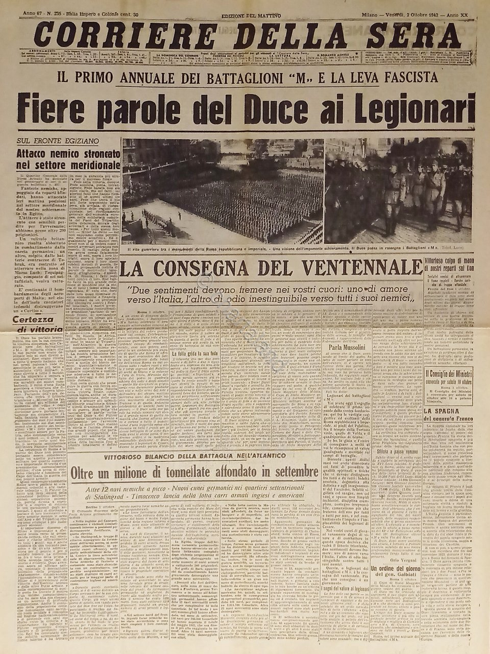 WWII - Corriere della Sera N. 235 - 1942 Fiere parole del Duce ai Legionari