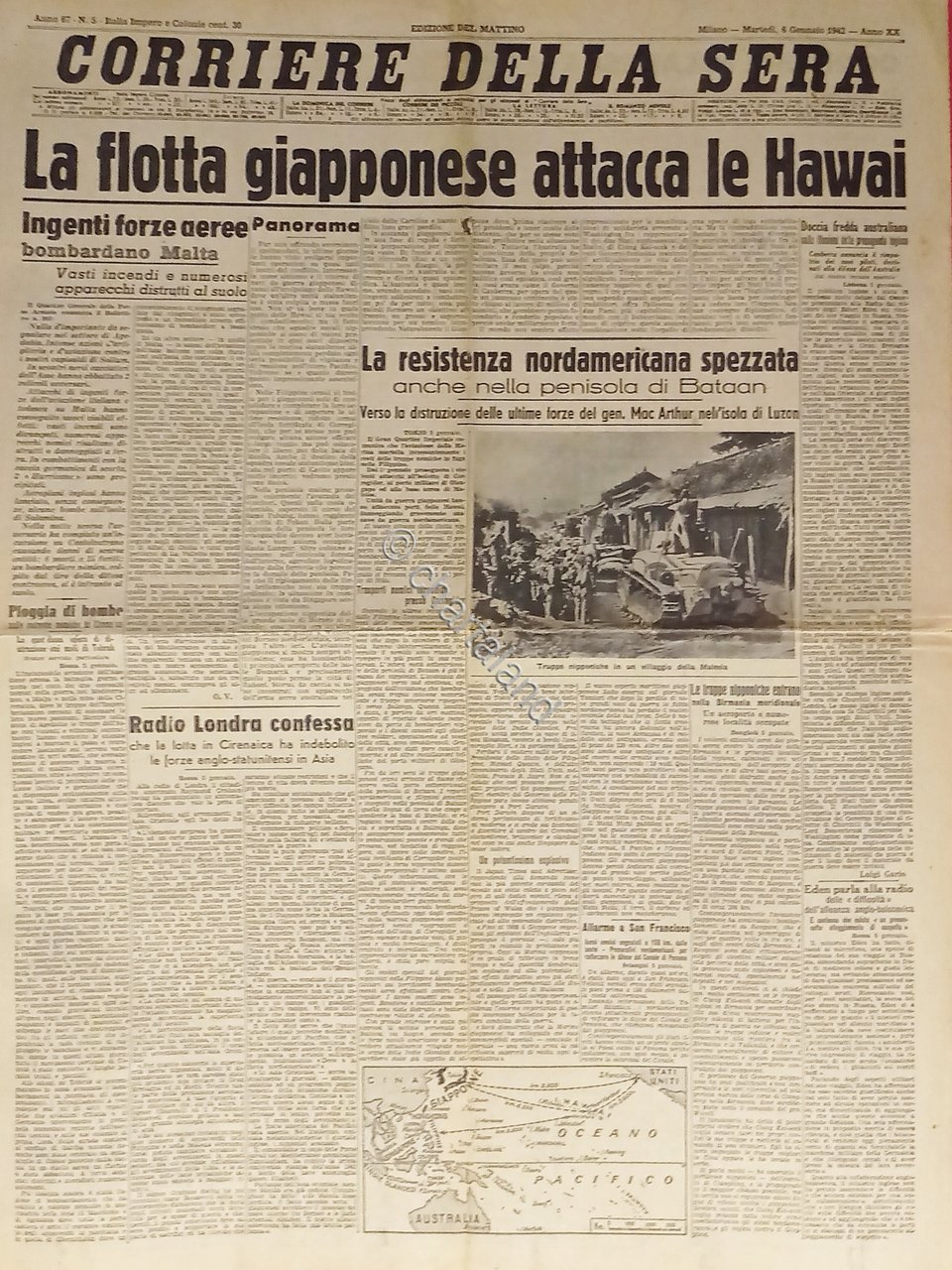 WWII - Corriere della Sera N. 5 - 1942 La flotta giapponese attacca le Hawai Testo in lingua italiana. Pagine 4 con illustrazioni. Condizioni buone con piccoli segni del tempo come da foto.