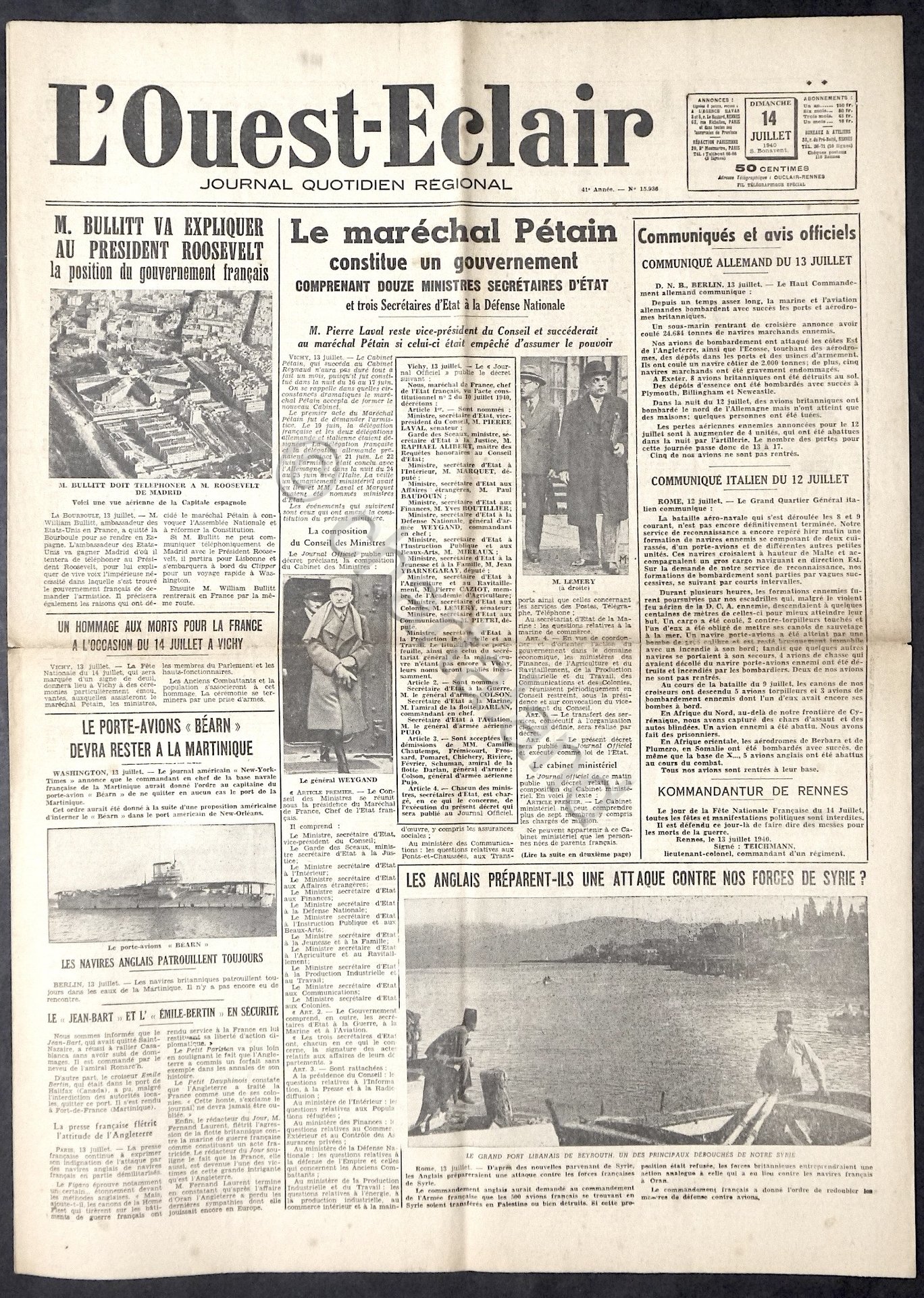 WWII Giornale Francia - L' Ouest-Eclair - Journal quotidien regional - N. 15936 - 14 luglio 1940