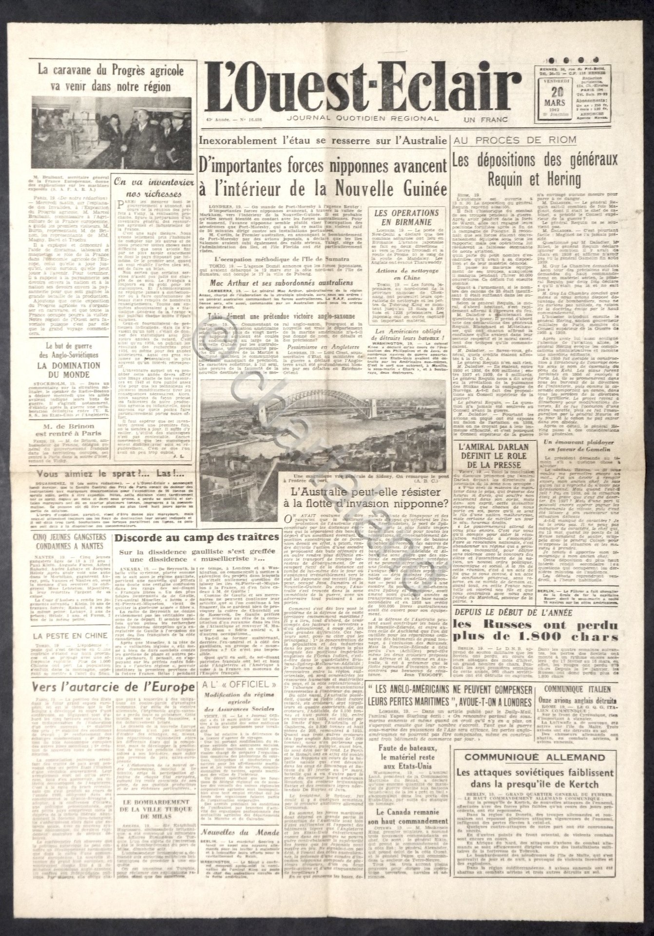 WWII Giornale Francia - L' Ouest-Eclair - N. 16498 - 20 marzo 1942