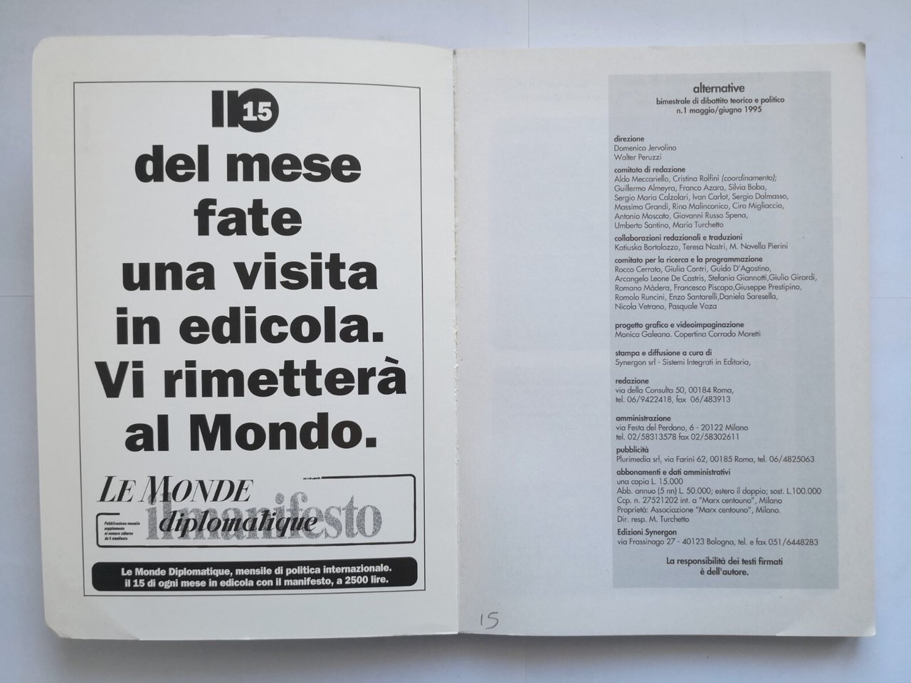 ALTERNATIVE Numero 1 maggio giugno 1995. Bimestrale di dibattito teorico e politica.