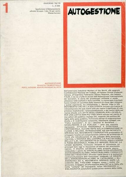 12 fasc. : ill. ; 28 x 20 cm. «Una rivista anarcosindacalista per l'azione anarcosindacalista»: così si presentava la rivista «Autogestione». L'iniziativa della rivista fu promossa da militanti anarchici e libertari di varie località (Milano, Bergamo, Bologna, Reggio Emilia, Firenze, Arezzo) convinti - come si leggeva nell'editoriale di presentazione - della necessità di uno strumento di collegamento e di socializzazione delle informazioni, delle esperienze, delle analisi. N. 1 (inverno 1978/79); 2 (primavera 1979); 3 (autunno 1979); 4 (primavera 1980); 5 (estate 1980); 6 (autunno/inverno 1980); 7 (primavera/estate 1981); 8 (autunno/inverno); 9 (primavera 1982); 10 (dicembre 1984); 11 (giugno/agosto 1985); 12 (maggio/giugno 1986). Fascicoli in brossura e spillati, coperta in cartoncino flessibile plastificato opaco e colorato, all'interno varie immagini in b/n. Qualche leggero segno del tempo alle coperte per il resto esemplari integri. Codice libreria 6884.