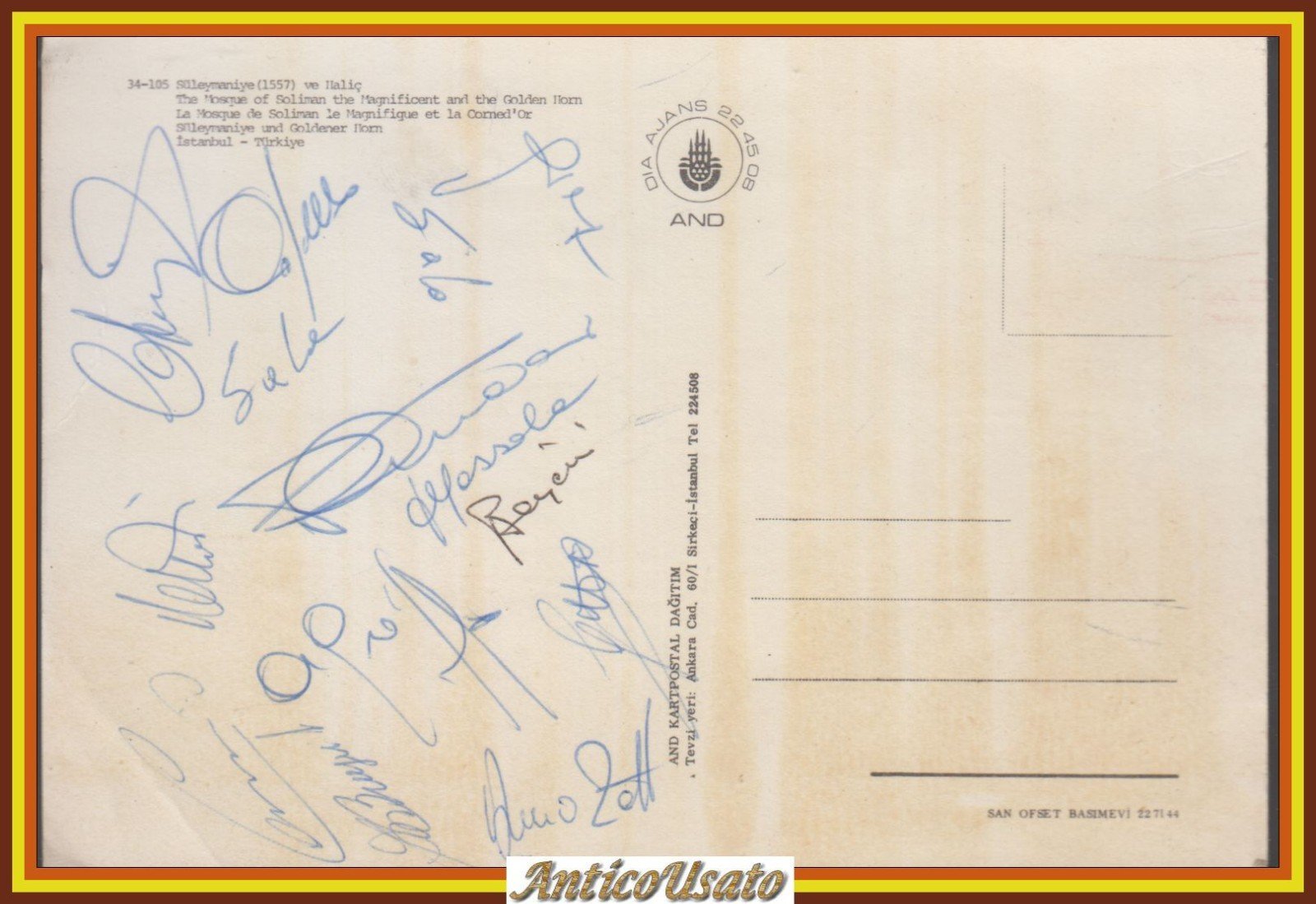 Le firme sono di: Zoff, Chinaglia, Burgnich, Sala (2 volte) Mazzola, Anastasi, Causio, Riva, Capello, Romeo, Agroppi, Rosato, Valcareggi. La cartolina è una cartolina turca. Un pezzo forse unico e sicuramente irripetibile!