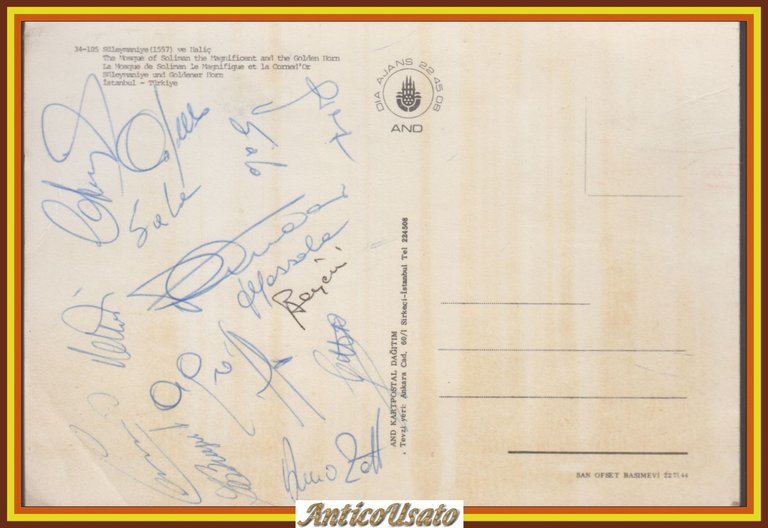 Un vero e proprio pezzo di storia del calcio! Una cartolina con gli autografi di tutti i calciatori che parteciparono alla sfida tra Turchia e Italia nelle qualificazioni ai mondiali del 25 febbraio 1973.