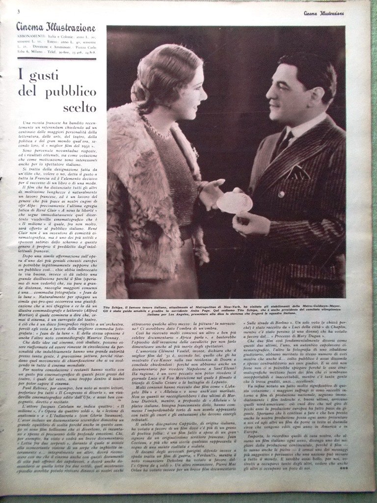 Cinema Illustrazione 13 Aprile 1932 Garbo Dvorak Tito Schipa keaton Laura Nucci