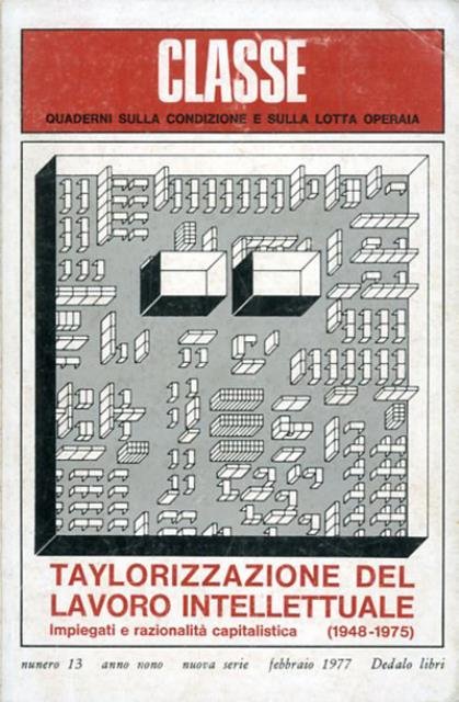 229 p. ; 21 x 14 cm. La rivista «Classe» fondata da Stefano Merli aveva come principale scopo quello di contribuire, nel campo della ricerca storico-teorica, alla ricostruzione di una strategia unitaria del movimento operaio. Merli, storico e militante socialista, cercò a lungo di dare consapevolezza e spessore storico-critico a quel tentativo di rinnovamento dal basso della storiografia del movimento operaio italiano che sull’onda della crisi del 1956 aveva trovato le sue più significative espressioni culturali nell’operaismo marxista di Raniero Panzieri e nella riscoperta dell’“altra storia” di Bosio e Montaldi. Il primo numero della rivista esce nel giugno 1969 e l'ultimo, n. 22, nel dicembre 1982. Numeri monografici: 13. Taylorizzazione del lavoro intellettuale. Impiegati e razionalità capitalistica (1948-1975). Brossura editoriale, coperta illustrata in cartoncino flessibile colorato (b/n e rosso) e plastificato. Qualche leggero segno del tempo, ingiallimento della carta e qualche fioritura per il resto esemplare integro. Codice libreria 8205.