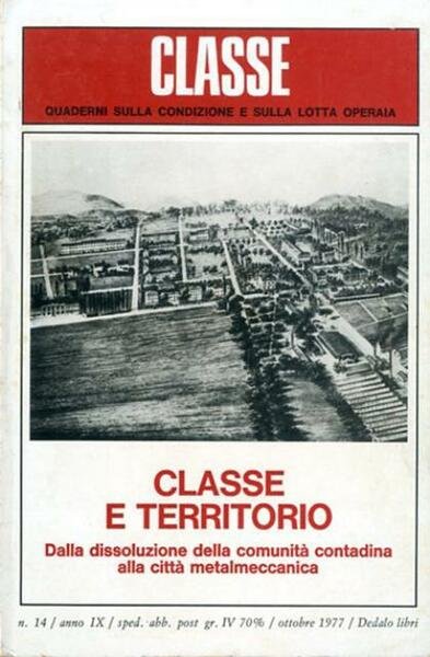 258 p. ; 21 x 14 cm. La rivista «Classe» fondata da Stefano Merli aveva come principale scopo quello di contribuire, nel campo della ricerca storico-teorica, alla ricostruzione di una strategia unitaria del movimento operaio. Merli, storico e militante socialista, cercò a lungo di dare consapevolezza e spessore storico-critico a quel tentativo di rinnovamento dal basso della storiografia del movimento operaio italiano che sull’onda della crisi del 1956 aveva trovato le sue più significative espressioni culturali nell’operaismo marxista di Raniero Panzieri e nella riscoperta dell’“altra storia” di Bosio e Montaldi. Il primo numero della rivista esce nel giugno 1969 e l'ultimo, n. 22, nel dicembre 1982. Numeri monografici: 14. Classe e territorio. Dalla dissoluzione della comunità contadina alla città metalmenccanica. Brossura editoriale, coperta illustrata in cartoncino flessibile colorato (b/n e rosso) e plastificato. Qualche leggero segno del tempo, ingiallimento della carta e qualche fioritura per il resto esemplare integro. Codice libreria 8206.