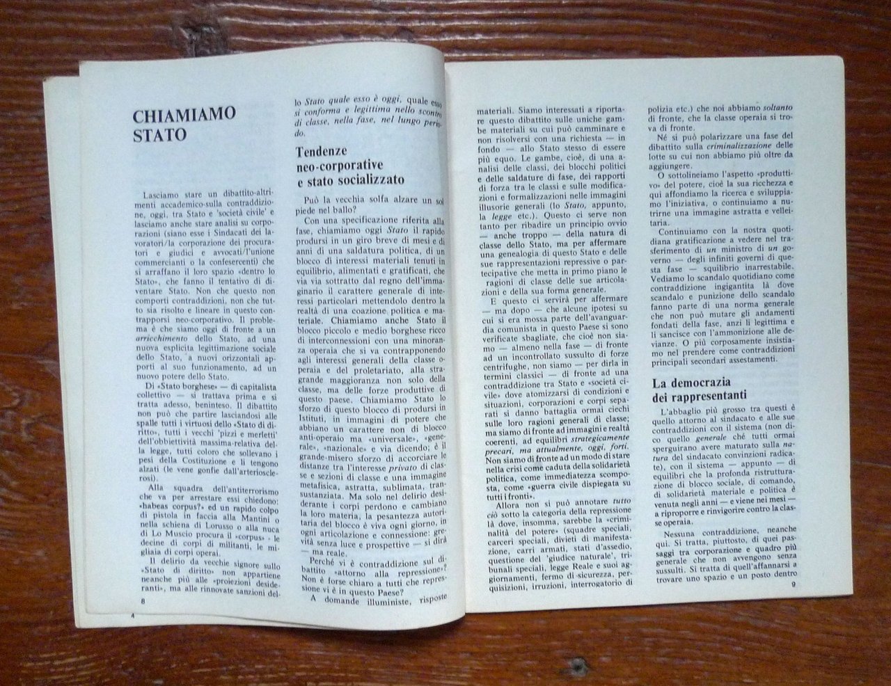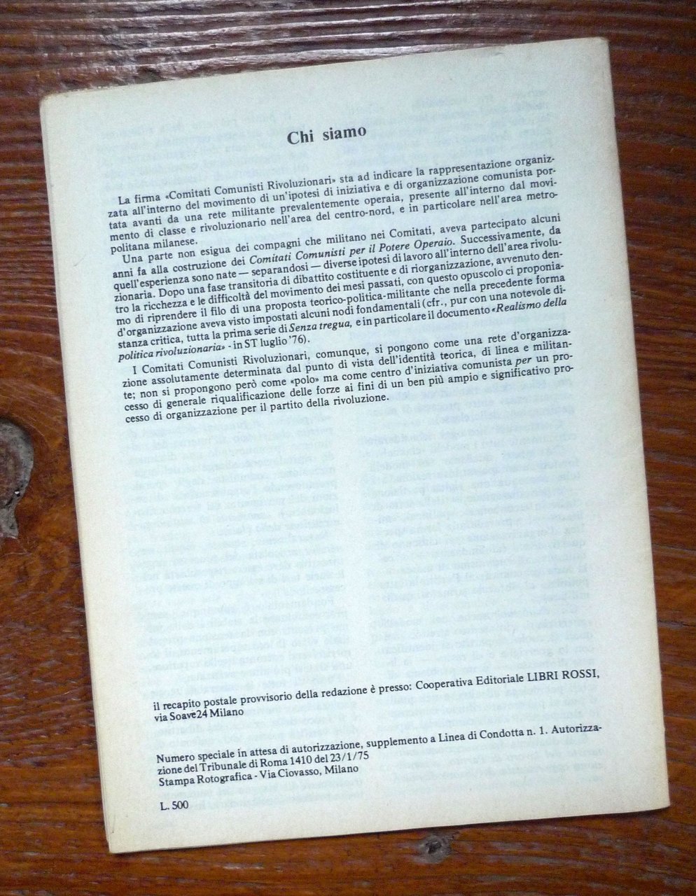 Comitati Comunisti Rivoluzionari,POTERE OPERAIO PER IL COMUNISMO.Numero speciale in attesa di autorizzazione.Supplemento a Linea di Condotta n.1.Cooperativa Editoriale LIBRI ROSSI, Milano,senza data (1977)22x16,5 cm., rilegatura con punto metallico, pp.48,peso: g.300cod.10078CONDIZIONI DELL'OPUSCOLO: buone,imperfezioni e ingiallimento alla copertina
