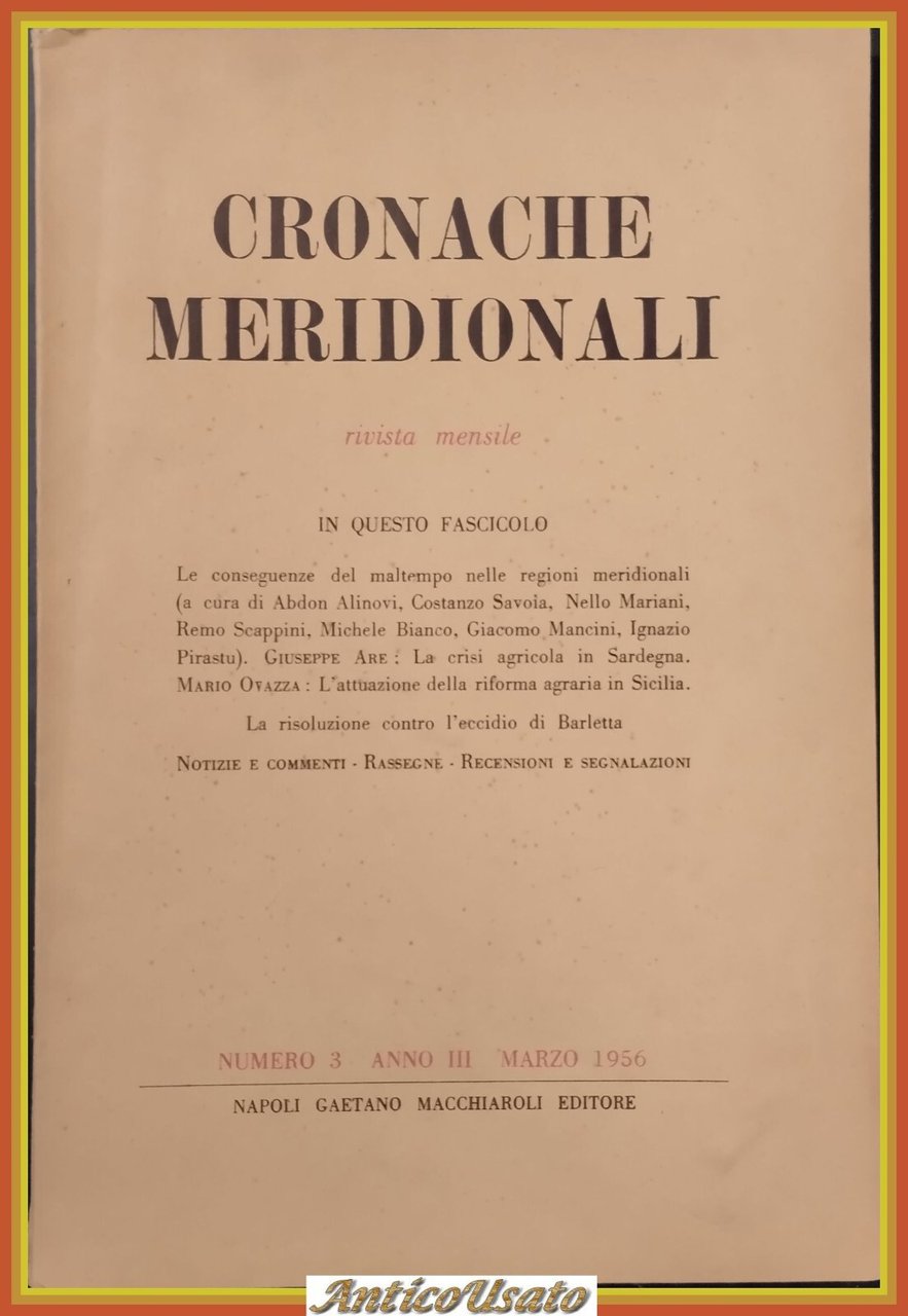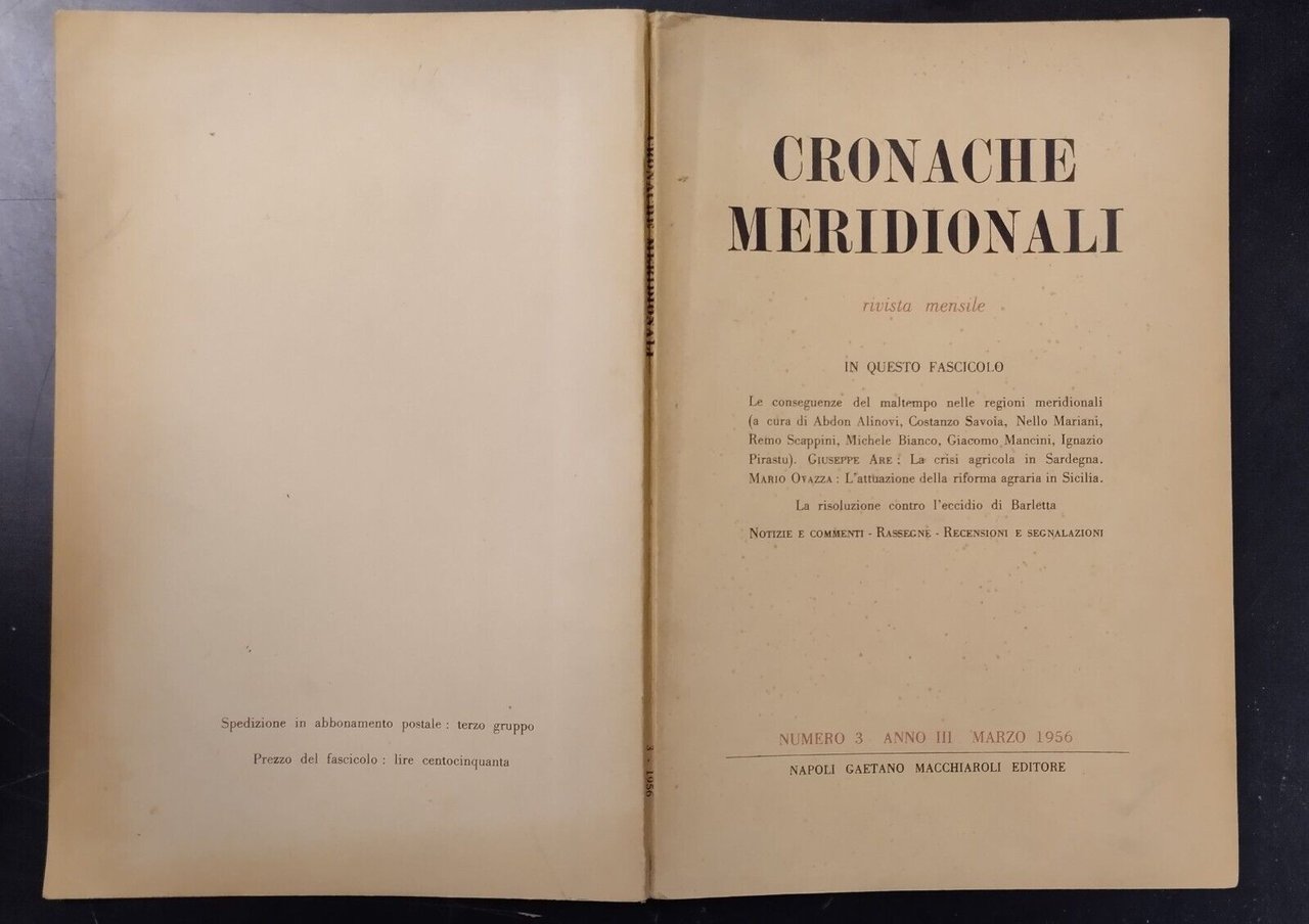 CRONACHE MERIDIONALI, RIVISTA MENSILE, Anno III numero 3. Contiene: le conseguenze del maltempo nelle regioni meridionali, la crisi agricola in Sardegna, l'attuazione della riforma agraria in Sicilia, La risoluzione contro l'eccidio di Barletta.