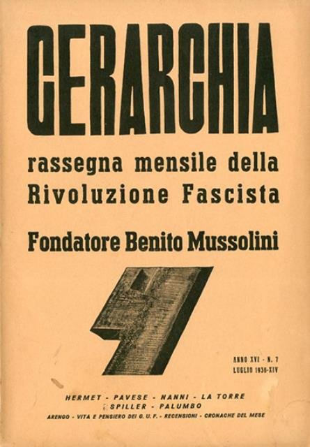 PP. 447-517, [6] : ill. ; 26 x 18 cm. La rivista venne fondata, nel 1922, dallo stesso Benito Mussolini, con lo scopo principale di dare un corpo ideologico e teorico al movimento fascista. Tra i nomi che collaborarono alla rivista possiamo trovare: lo storico Gioacchino Volpe, il pittore e poeta novecentista Ardengo Soffici, lo storico e giurista Arrigo Solmi, la critica d'arte Margherita Sarfatti, il pubblicista Franco Ciarlantini, il critico letterario Lorenzo Giusso. In questo numero articoli e collaborazioni di: Augusto Hermet, Roberto Pavese, Silus, Ugo Nanni, Quirita, Michele La Torre, Gaetano Spiller, Ugen, Antonio Palumbo. Brossura editoriale, coperta anteriore in cartoncino flessibile illustrata (b/n), disegno non firmato ma realizzato da Mario Sironi (1885-1961). Qualche lieve segno del tempo (ingiallimento della carta), per il resto esemplare integro. Codice libreria 8321.