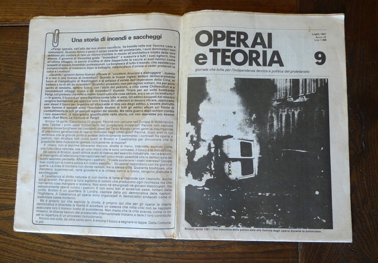OPERAI E TEORIA Anno IV n.9 Luglio 1981.Giornale che lotta per l'indipendenzateorica e politica del proletariato.Supplemento a Stampa Alternativa.Direttore responsabile: Marcello Baraghini.Stampa Litografica, Busto Arsizio (VA), Milano 1981,43x30 cm., pp.15,articoli su inflazione e costo del lavoro,Stalin e l'economia sovietica negli anni '50,proteste operaie alla Breda e all'Alfa Romeo,peso: g.300cod.4309CONDIZIONI DEL PERIODICO: buone,pagine ingiallite e fioriture,piega centrale,piccolo strappetto in corrispondenza della piega